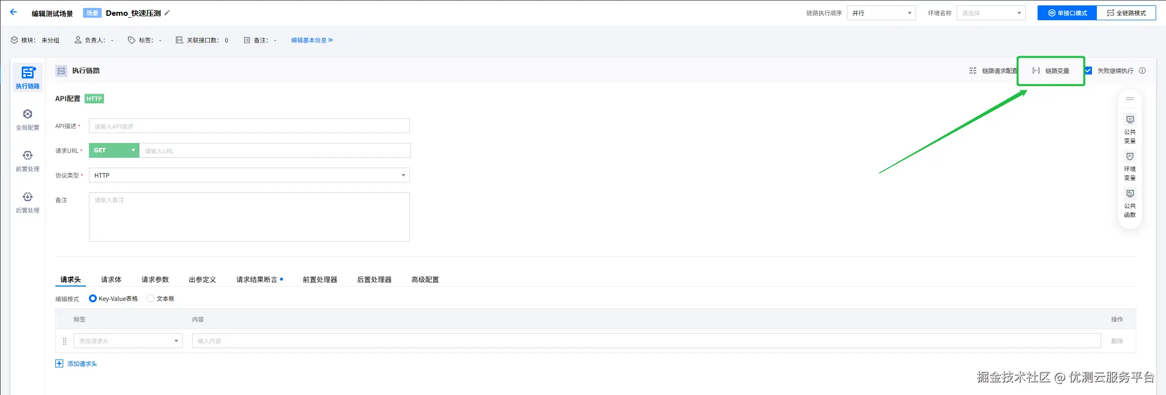 推荐使用全局文件变量,对于多条链路可共享测试数据。