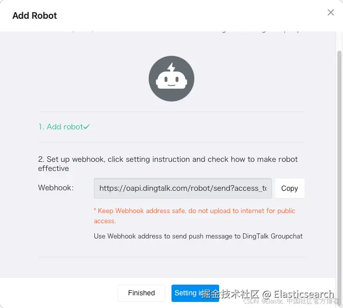 这样我们就创建了一个 Robot。我们点击上面的 Copy 保留 Webhook 的地址以供在 Kibana 中进行配置。点击上面的 “Setting instruction” 我们可以查看具体的操作步骤。点击上面的 Finished: