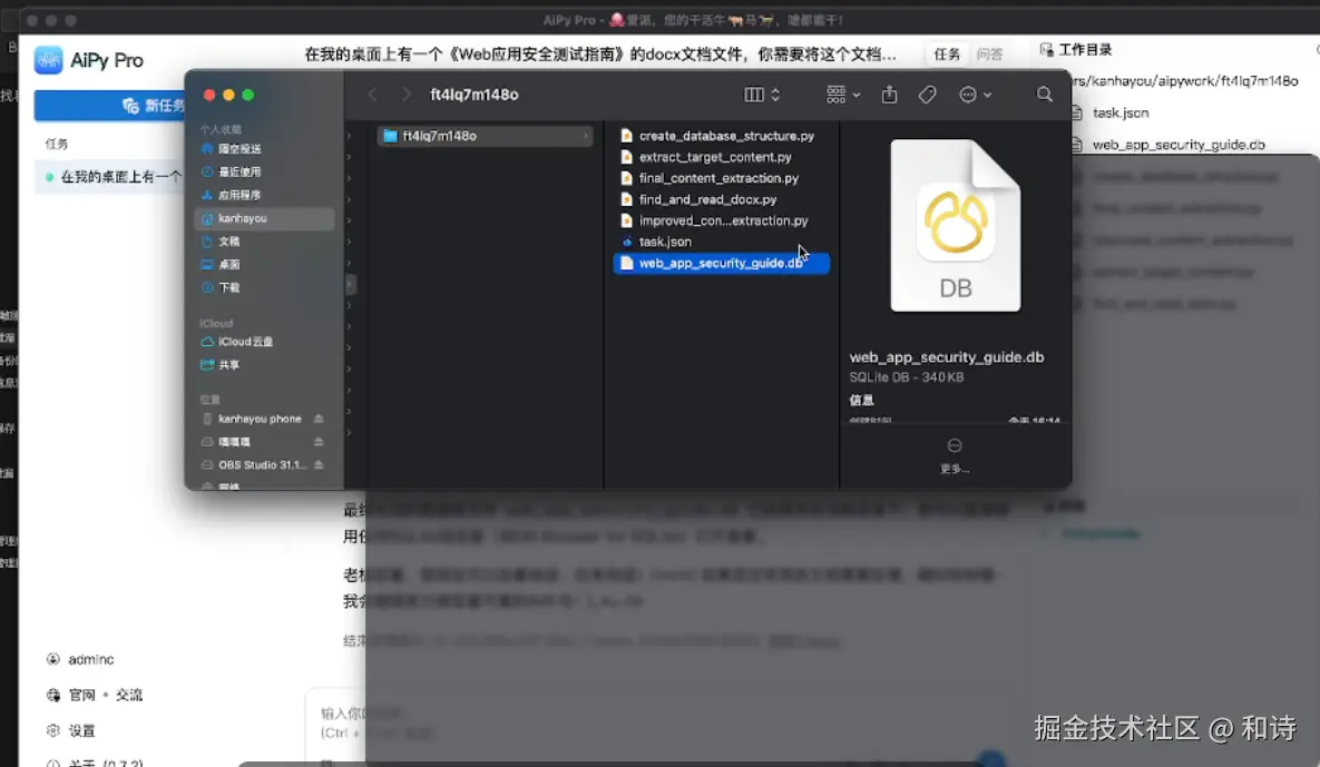 提示词:在我的桌面上有一个《Web应用安全测试指南》的docx文档文件,你需要将这个文档下的 标题二.Web应用安全测试指南 的所有内容进行db文件的写入存储,自动帮我做好分类,最后给我一个db文件