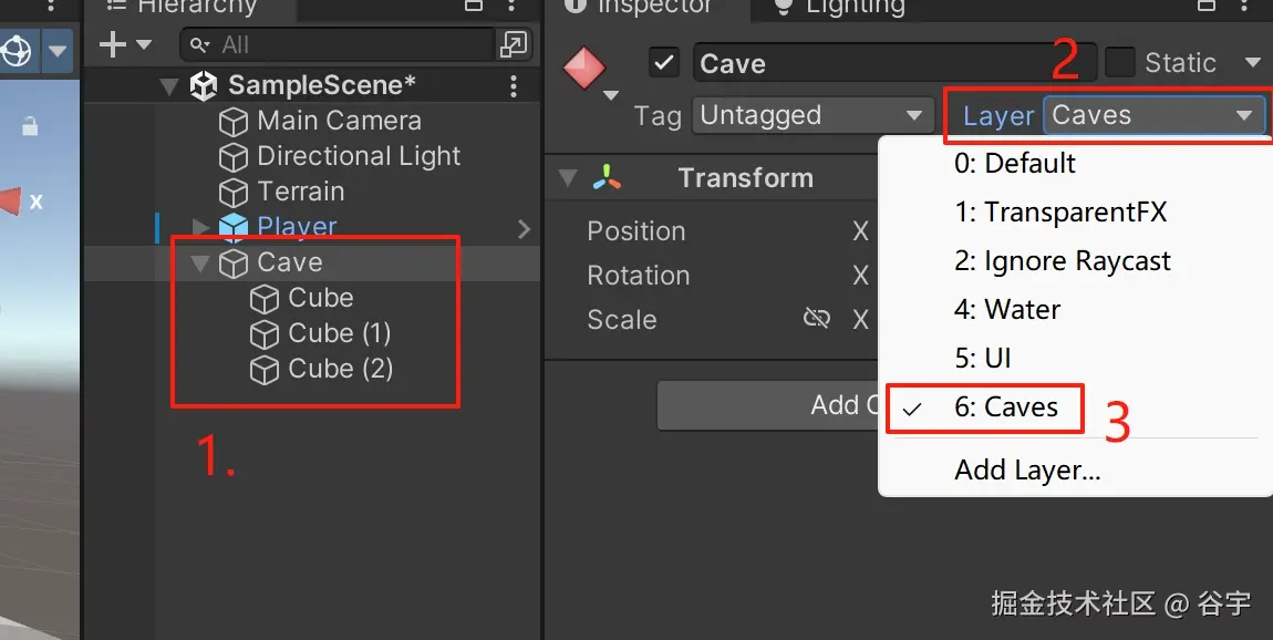 3.选中隧道的父节点(就是刚创建的“空物体”),在“Inspector”菜单下,点击“Layer”,为隧道创建一个障碍物的Layer(我这里也是命名为“Cave”),用于后续的实时碰撞检测。