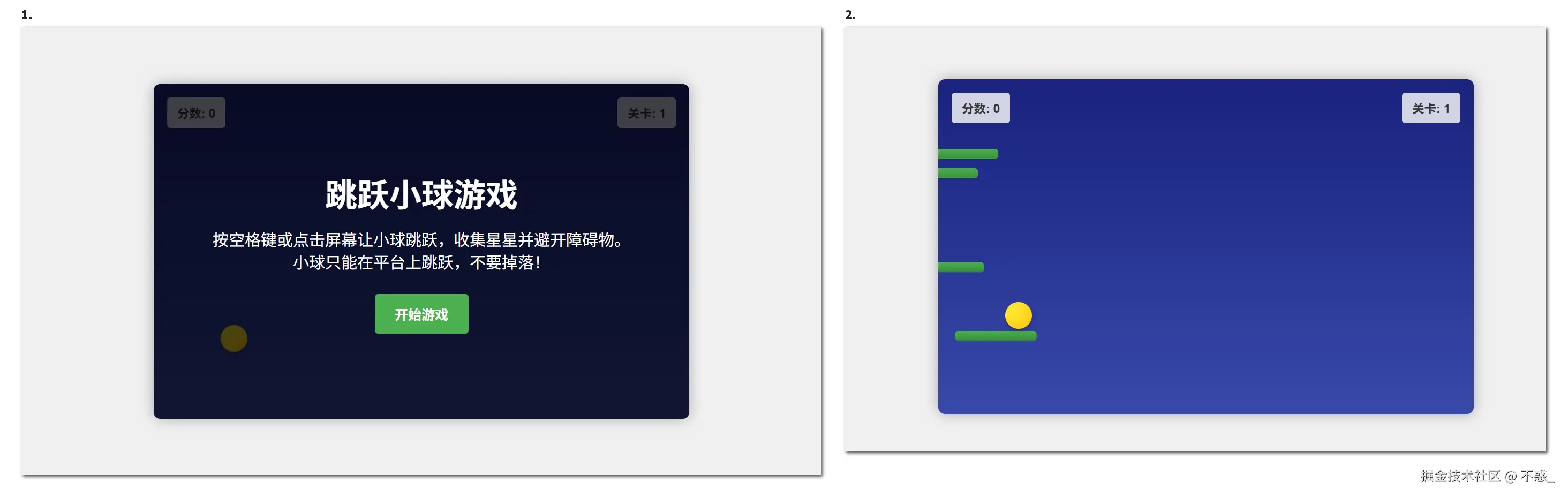 ✅ 顺滑的跳跃逻辑:点击或按空格,小球自然弹起,还支持连跳。 ✅ 障碍物与平台系统:障碍物随机生成,平台错落摆放,增加难度。 ✅ 碰撞 & 掉落检测:碰到障碍物或掉下平台,游戏立刻结束,提示重新开始。 ✅ 动态背景:渐变色和轻微的背景移动,让游戏看起来更“活”。