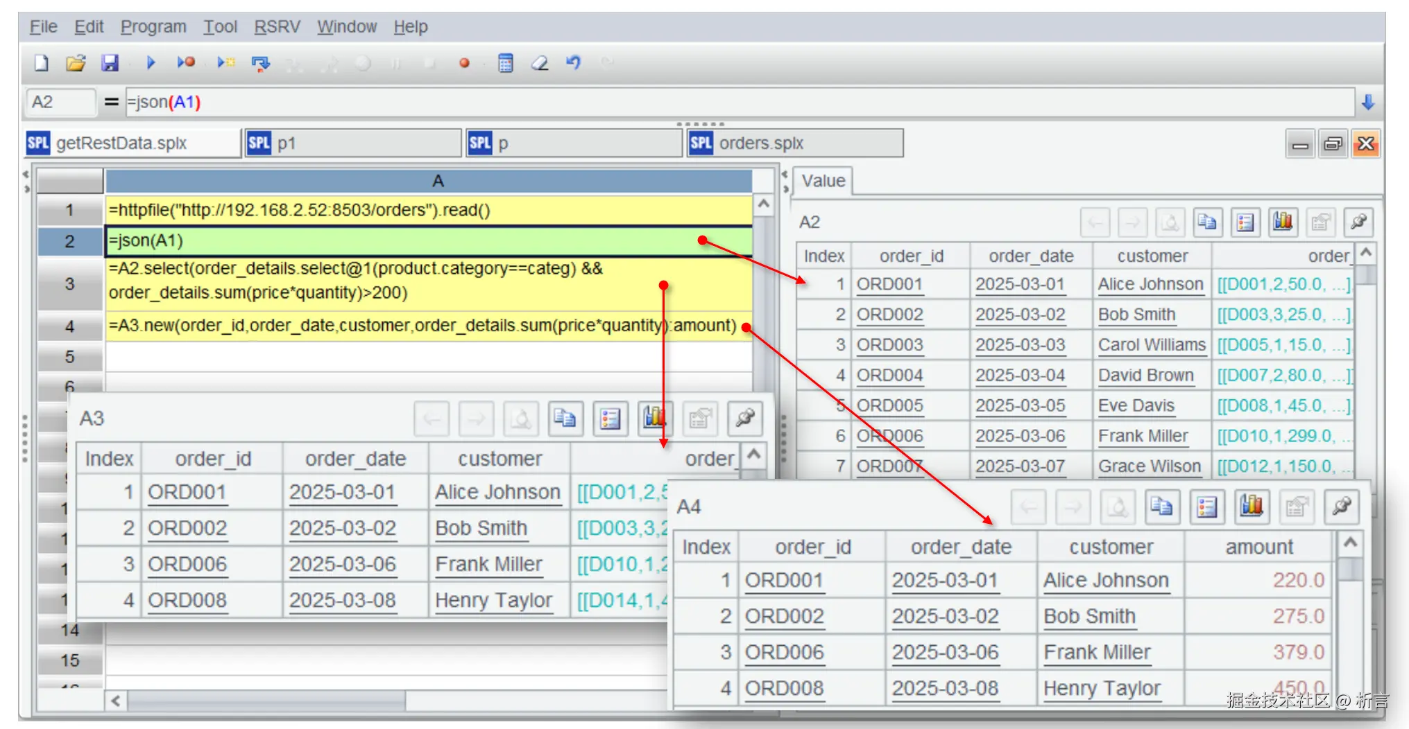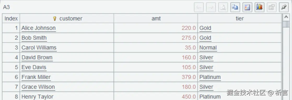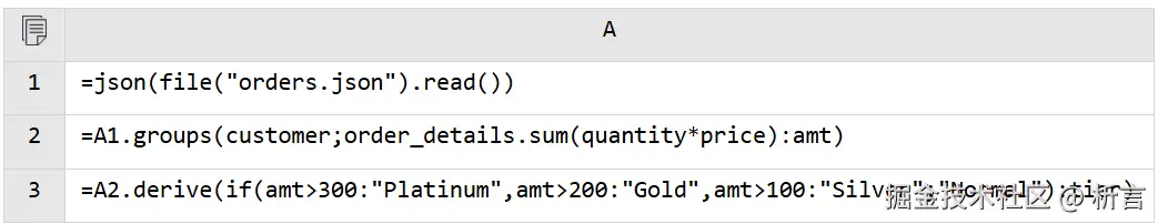 读入 JSON 后按照客户汇总订单金额,A3 根据汇总后的订单金额来划分客户等级,可以得到这样的结果: