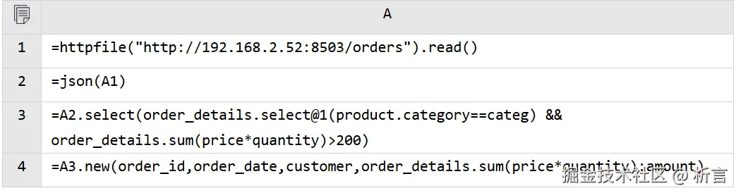 =json(httpfile("http://172.20.10.7:8503/orders").read()).select(order_details.select@1(product.category==categ) && order_details.sum(price*quantity)>200). new(order_id,order_date,customer,order_details.sum(price*quantity):amount)