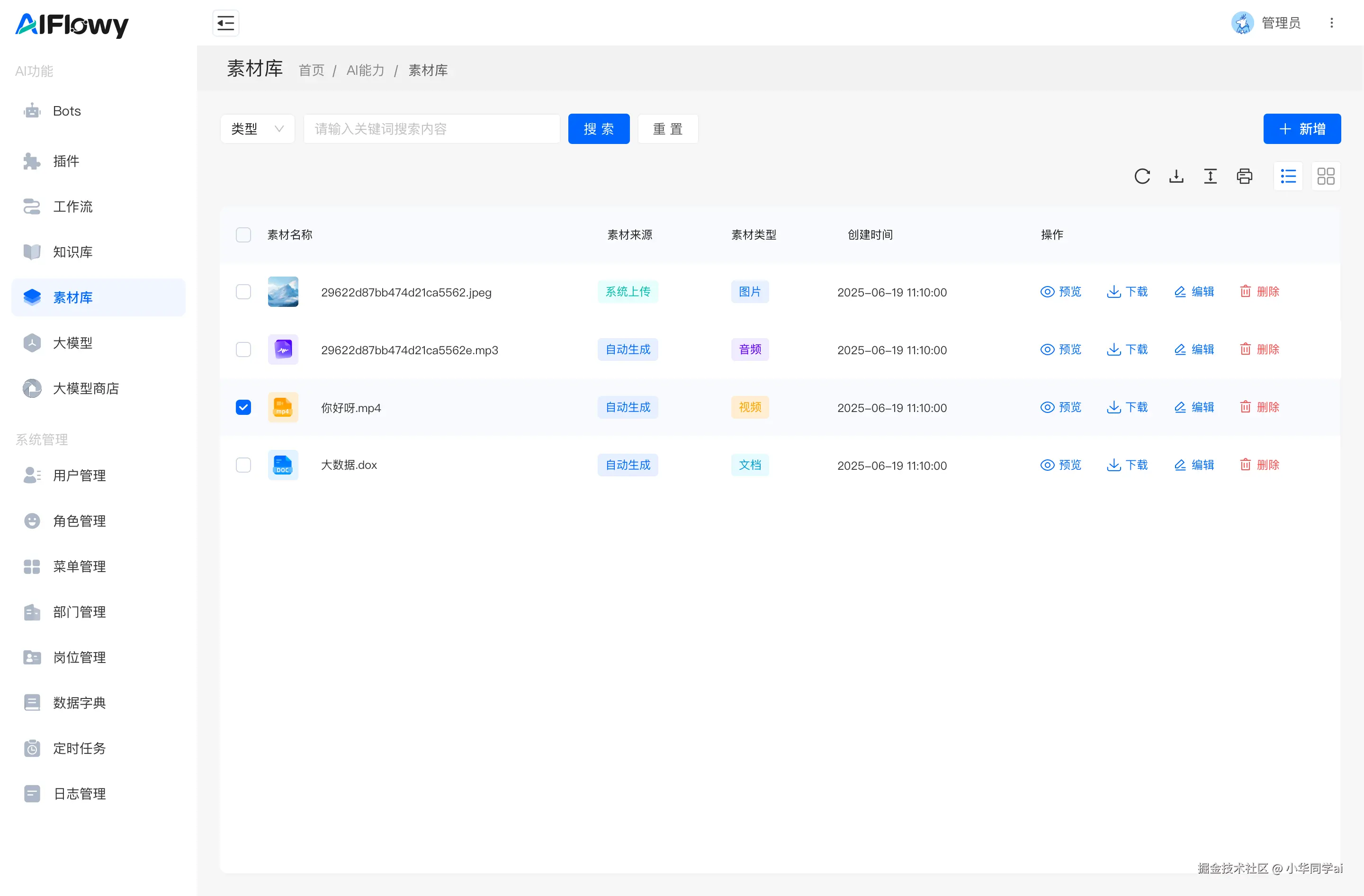 素材库:查看 AI 生成的内容素材,包括图片、音频、视频