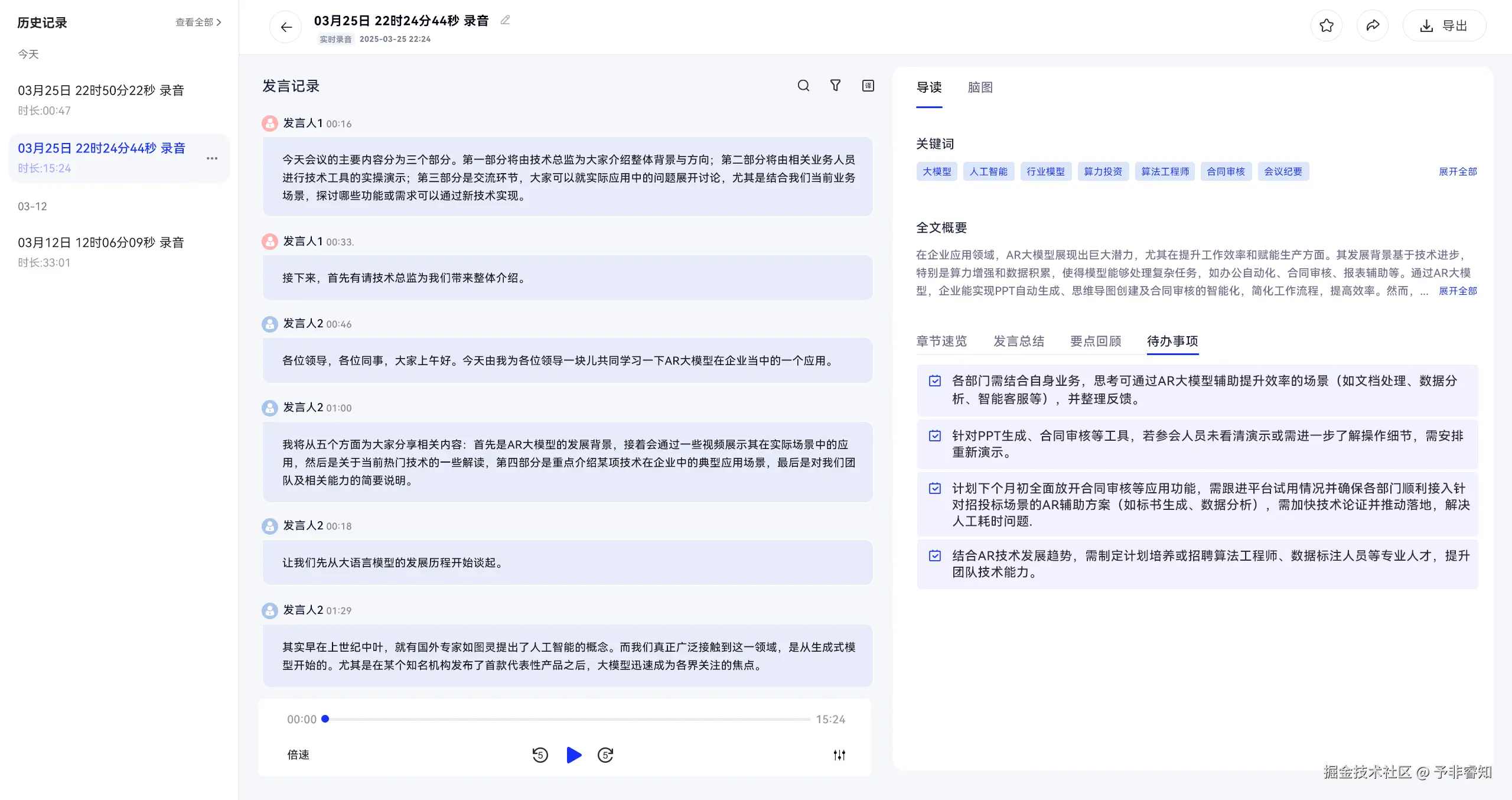 会议结束,真正的考验才刚刚开始。面对几万字的录音转写稿,整理会议纪要无异于一场噩梦。而现在,一杯咖啡的工夫,一份重点分明、条理清晰的会议纪要便已生成。AI能自动提炼核心观点、总结关键决策,最妙的是,它还能识别出待办事项,自动生成任务。这种从讨论到行动的无缝衔接,确保了每一次会议的成果都能落地生根,让团队执行力瞬间拉满。