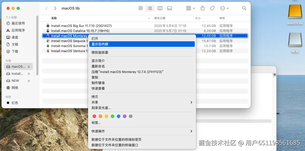 新分区 NEW 会自动挂载到系统,然后现在创建第二个macOS 镜像安装文件,同样从 macOS Installer 安装包打开包内容,找到\Contents\Resources\createinstallmedia