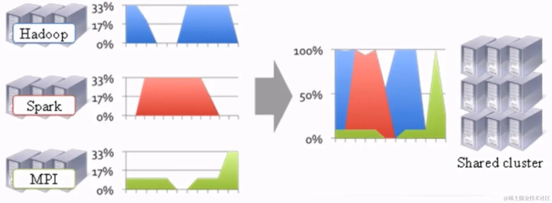如果没有通用资源管理系统,只能为多个集群分别提供数据