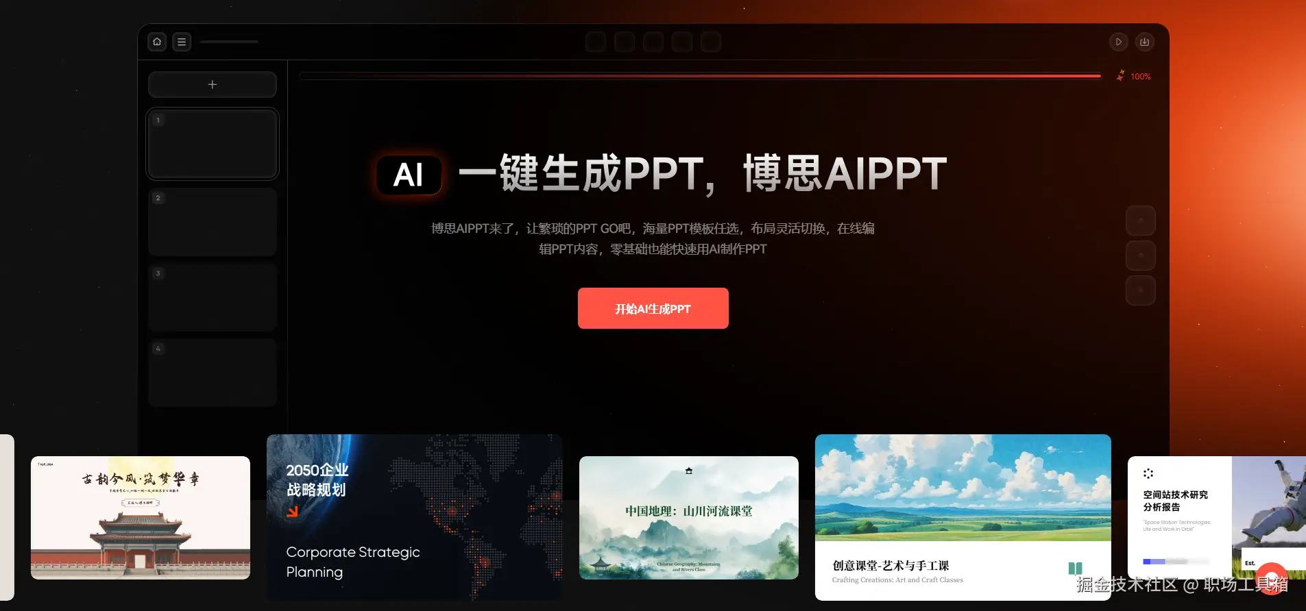 AI生成PPT:打破传统创作,AI一键生成PPT,开启做PPT新方式。博思AIPPT将帮助你轻松地创建精美、专业的PPT,免费开始,探索AI智能带来的无限可能性!