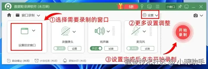 步骤①:下载安装数据 蛙录屏软件,启动该软件,在主界面中选择所需的录制模式,如“窗口录制”。
