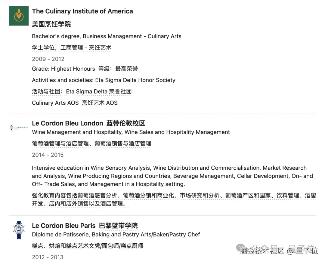2012 年,她在美国烹饪学院取得了烹饪艺术工商管理学士学位,之后到蓝带厨艺学院学习制作甜点以及葡萄酒,并曾在纽约和旧金山担任厨师。