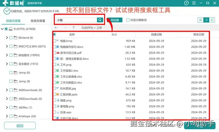 提示:扫描出来的文件过多怎么办?试试使用软件自带的“搜索框”功能吧!在里面输入文件的名字后,就能把相关的文件筛选出来哦。