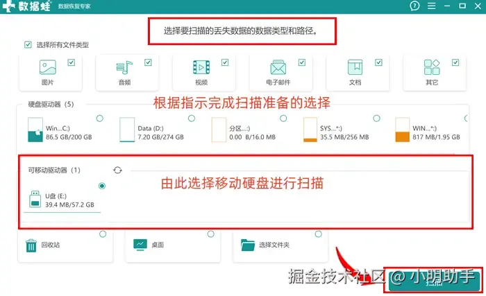 步骤1: 在软件首页根据自己的需求勾选上扫描的移动硬盘和文件类型,选好直接点击右下角的按钮让软件开始扫描工作;