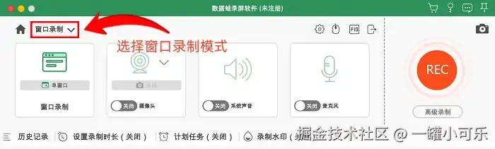 步骤1:打开软件后,第一件事就是要确定好录制的模式。我们可以在软件的左上角进行选择。这次我们就以 “窗口录制” 为例。