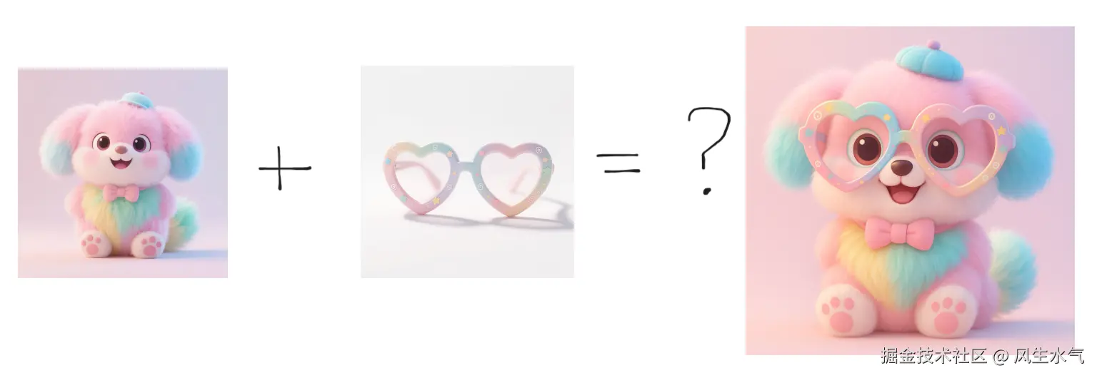 那么具体怎么做呢?相比于传统的复杂操作流程,我们进行需要在画布上进行简单的操作。如下图所示,我们将两个图片并列在图片中间用画笔画上一个加号。右边画上等号和问号,然后选中整体表达式进行生成即可。(从人类的视角看,很容易看出这个图要表达的意思,将图中的两个对象进行融合,但在这个应用中,通过多模态模型的识别能力,也能够识别到这种融合的意图,从而轻松的由AI帮助我们完成这样的设计工作!)最终生成的效果如开头的图片所示,可以看到几乎完美的将两个图片中的内容融合在了一起,完成了我们的需求。
