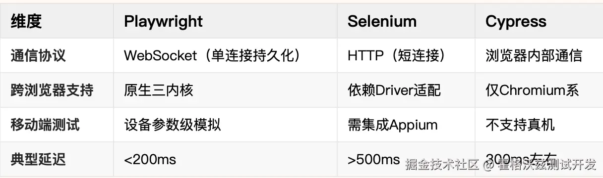 基于HTTP协议与浏览器Driver通信,每次操作需重建连接,平均延迟>500ms