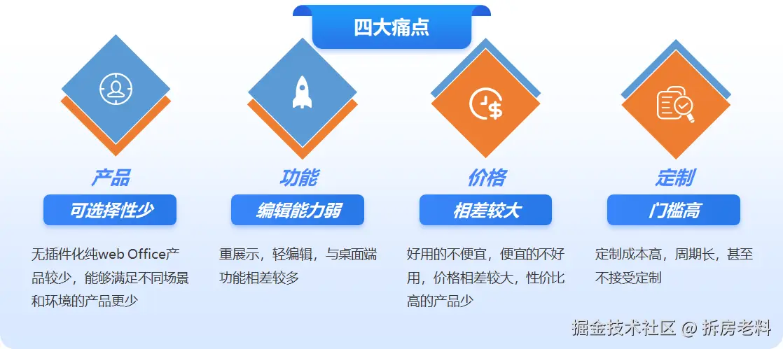 | 环境依赖 | 低,依赖浏览器版本 | 低,依赖浏览器版本 | 高,依赖浏览器版本、操作系统、且本机需要安装微软、金山相应版本的 Office 软件 | 低,依赖浏览器版本 |