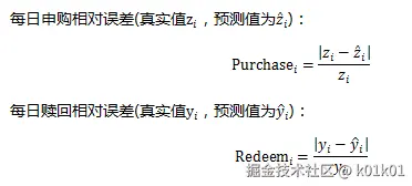 1) 计算所有用户在测试集上每天的申购及赎回总额与实际情况总额的误差。