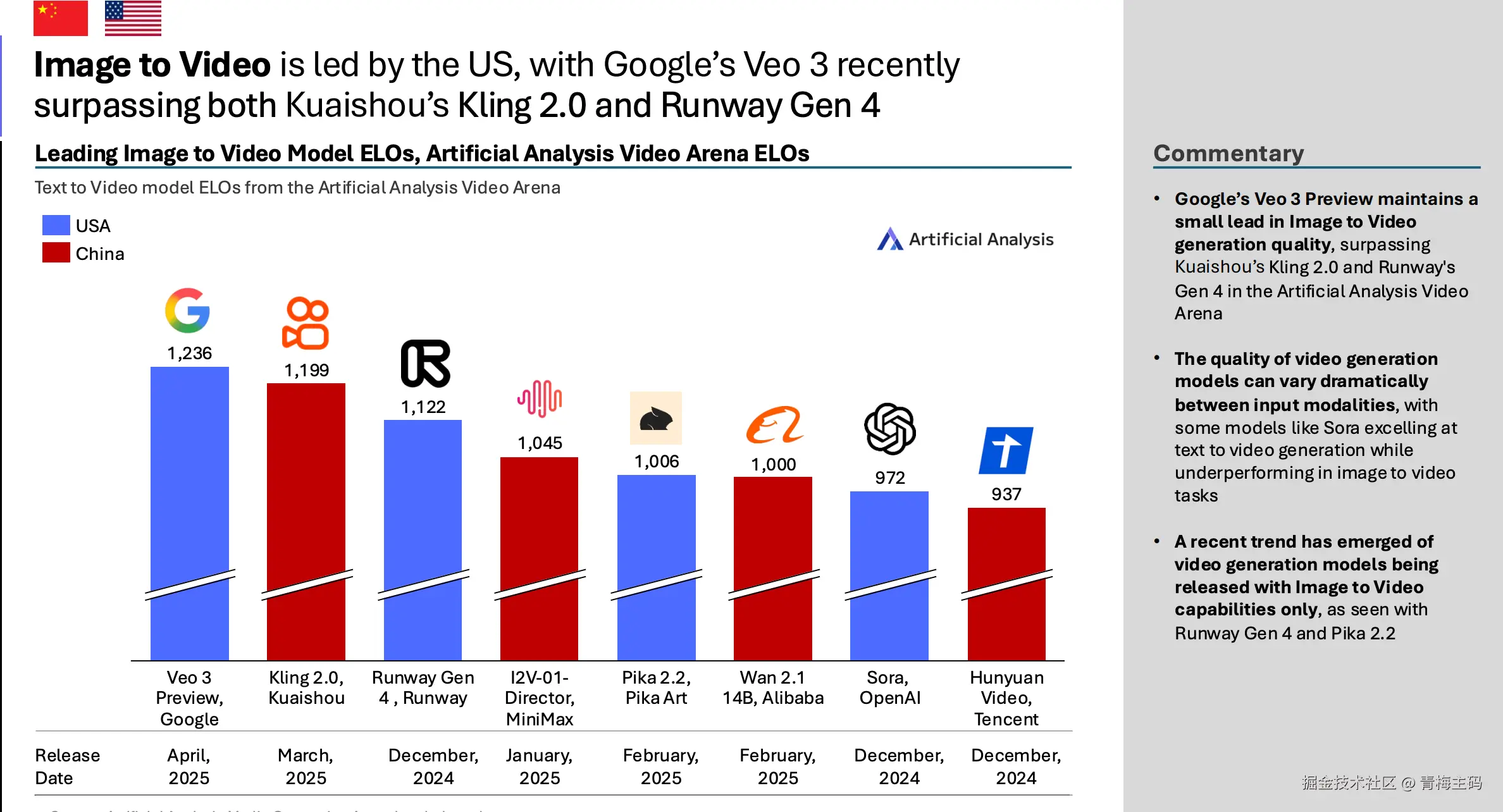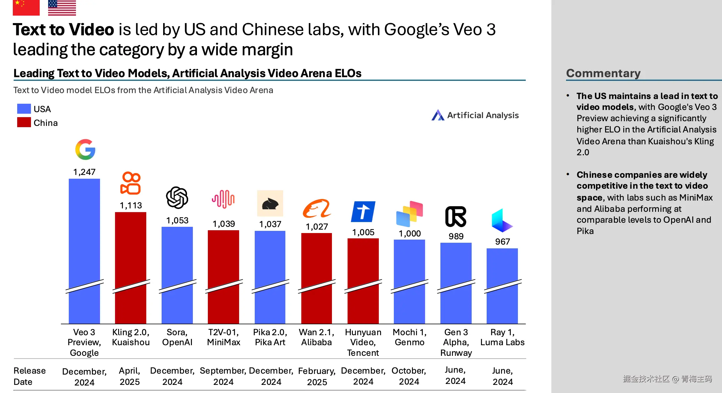 文本到视频由美国领导,Google Veo 3 Preview(1247 ELO)远超 Kuaishou Kling 2.0(1133*)。中国如 MiniMax T2V-01(1053)、Alibaba Wan 2.1(1039)。
