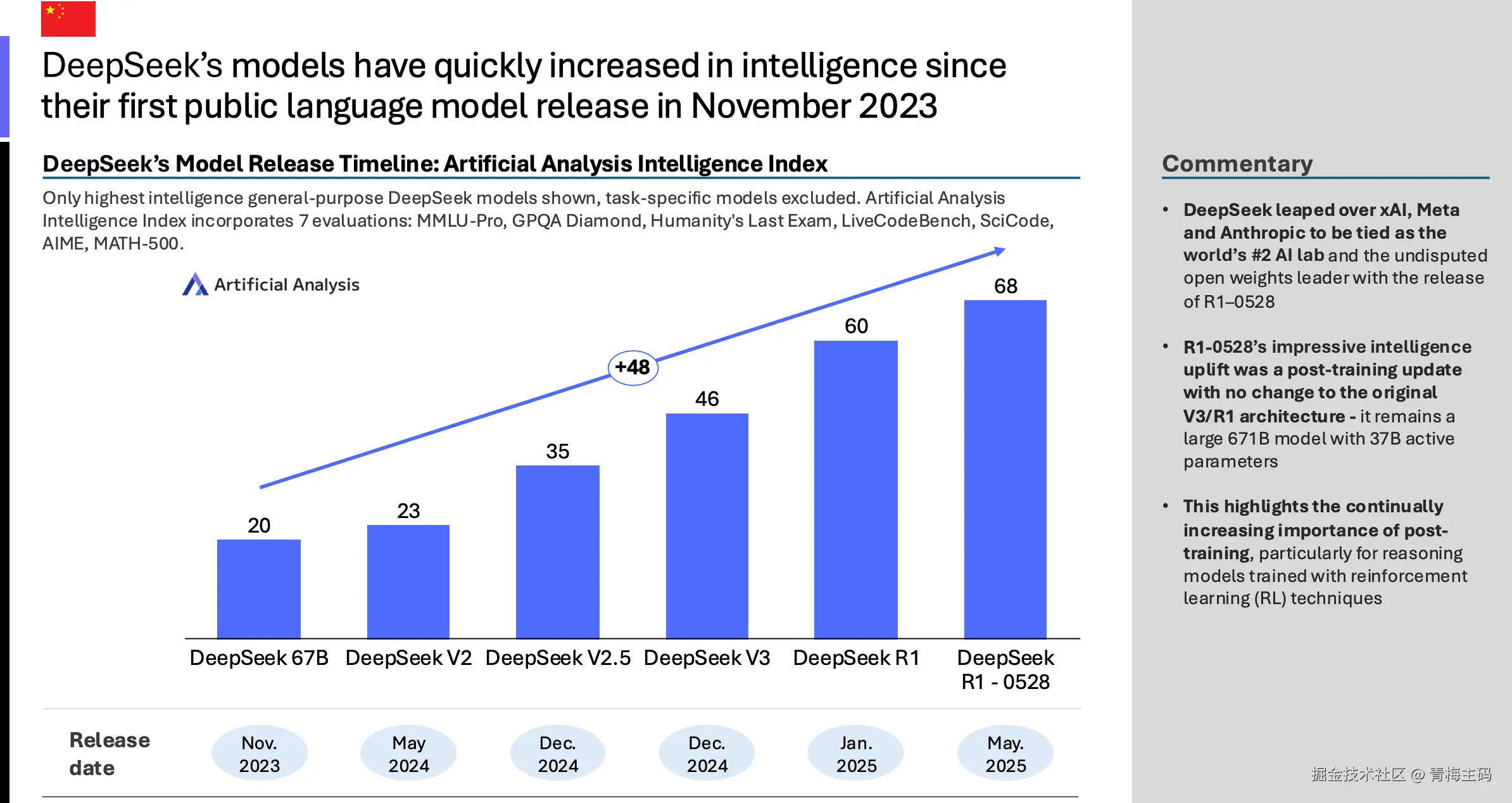 DeepSeek 的模型智能自2023年11月首次发布以来快速提升:从 DeepSeek LLM 67B(智能指数20)到 V2(35)、V2.5(46)、V3(60)、R1(68),再到 R1-0528(68)。R1-0528 是对 V3/R1 架构的后训练更新,无需改变671B参数(活跃37B),突显强化学习(RL)技术在推理模型中的重要性。这使 DeepSeek 跃升为全球第二AI实验室,与 xAI、Meta 和 Anthropic 并列,并成为无可争议的开源权重领导者。