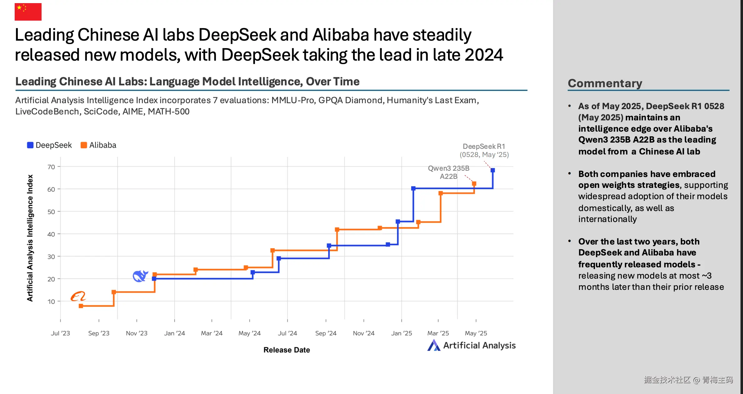DeepSeek 和 Alibaba 是中国AI前沿的主要推动者。截至2025年5月,DeepSeek R1 0528 在智能上略领先 Alibaba 的 Qwen3 235B A22B。两家公司均采用开源权重策略,促进模型在国内外广泛采用。在过去两年,它们每隔最多约3个月发布新模型。