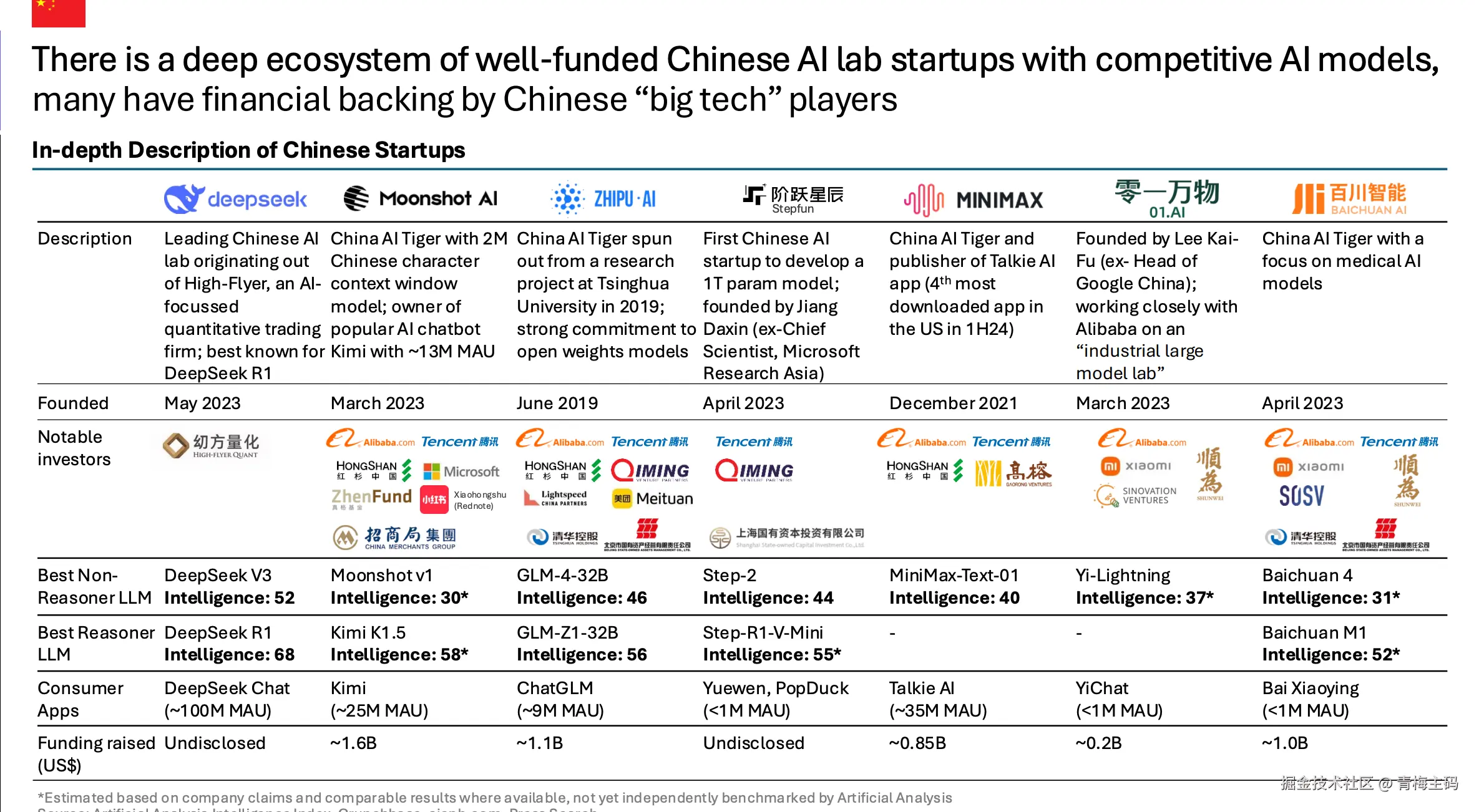 - Zhipu(2019年6月):最佳非推理 GLM-4-32B(46),最佳推理 GLM-Z1-32B(56)。应用 ChatGLM(约9M MAU)。资金约1.1B美元。