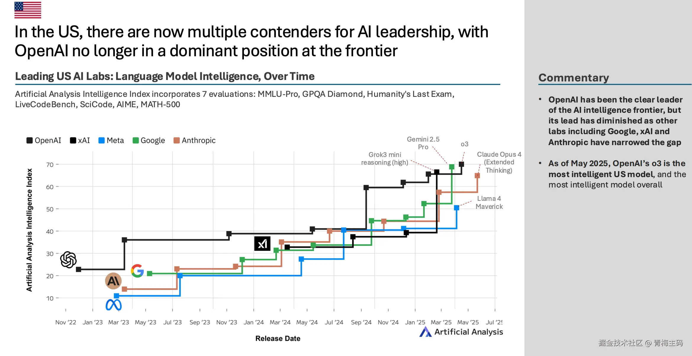 在美国,OpenAI 的主导地位减弱。其他实验室如 Google、xAI 和 Anthropic 已缩小差距。截至2025年5月,OpenAI o3 是美国最智能模型(整体最智能)。Google 的 Gemini 2.5 Pro、xAI 的 Grok3 mini reasoning (high) 和 Anthropic 的 Claude Opus 4 (Extended Thinking) 紧随其后。