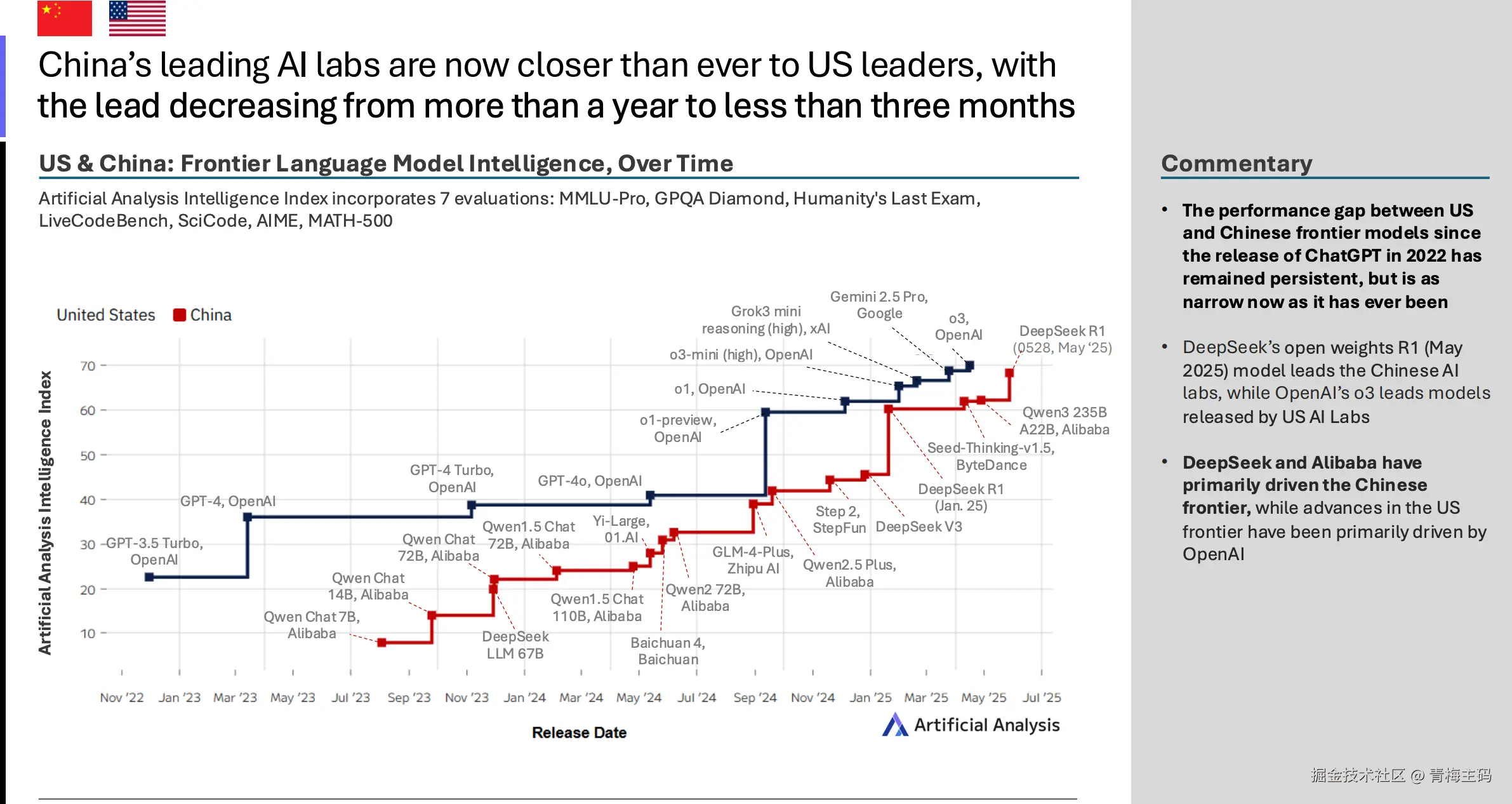 报告通过全面基准测试,包括语言模型API的性能评估和人群 sourced 竞技场投票,分析了AI技术和用例。数据来源于 Artificial Analysis Intelligence Index,该指数整合了7项评估:MMLU-Pro、GPQA Diamond、Humanity's Last Exam、LiveCodeBench、SciCode、AIME 和 MATH-500。报告强调,**中国 AI 实验室在前沿模型智能上迅速追赶美国,差距显著缩小。**以下是报告的核心内容整理,力求准确、客观。
