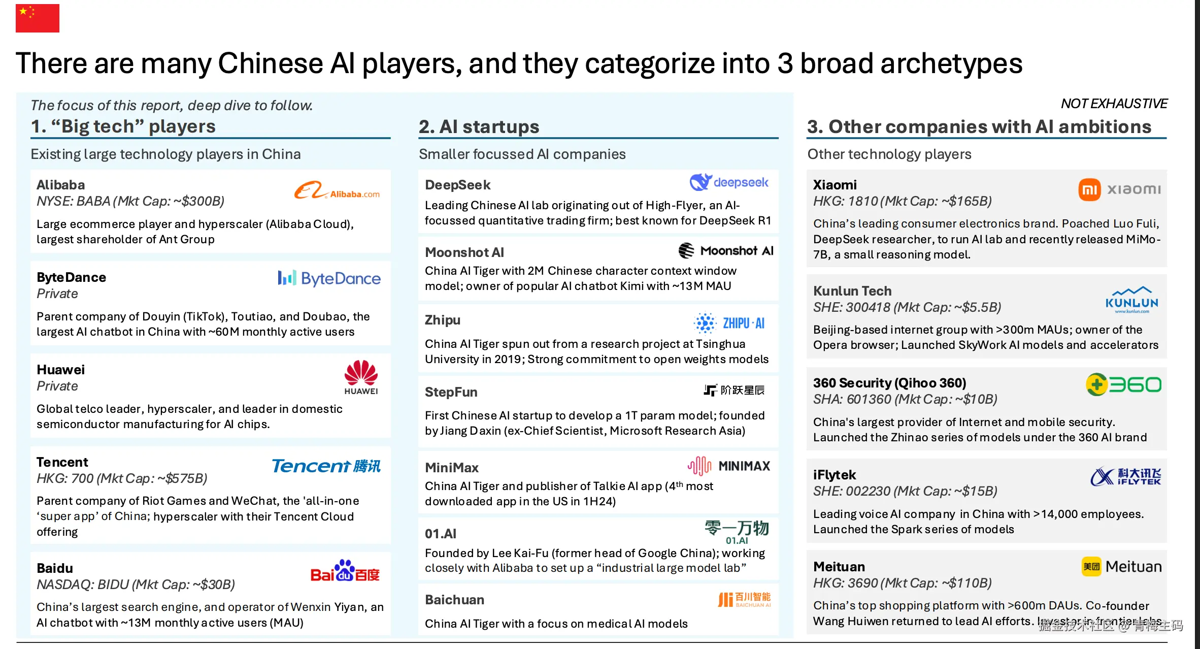 其他公司如 Kunlun Tech、360 Security、iFlytek、Meituan 和 Xiaomi 也在AI领域活跃。
