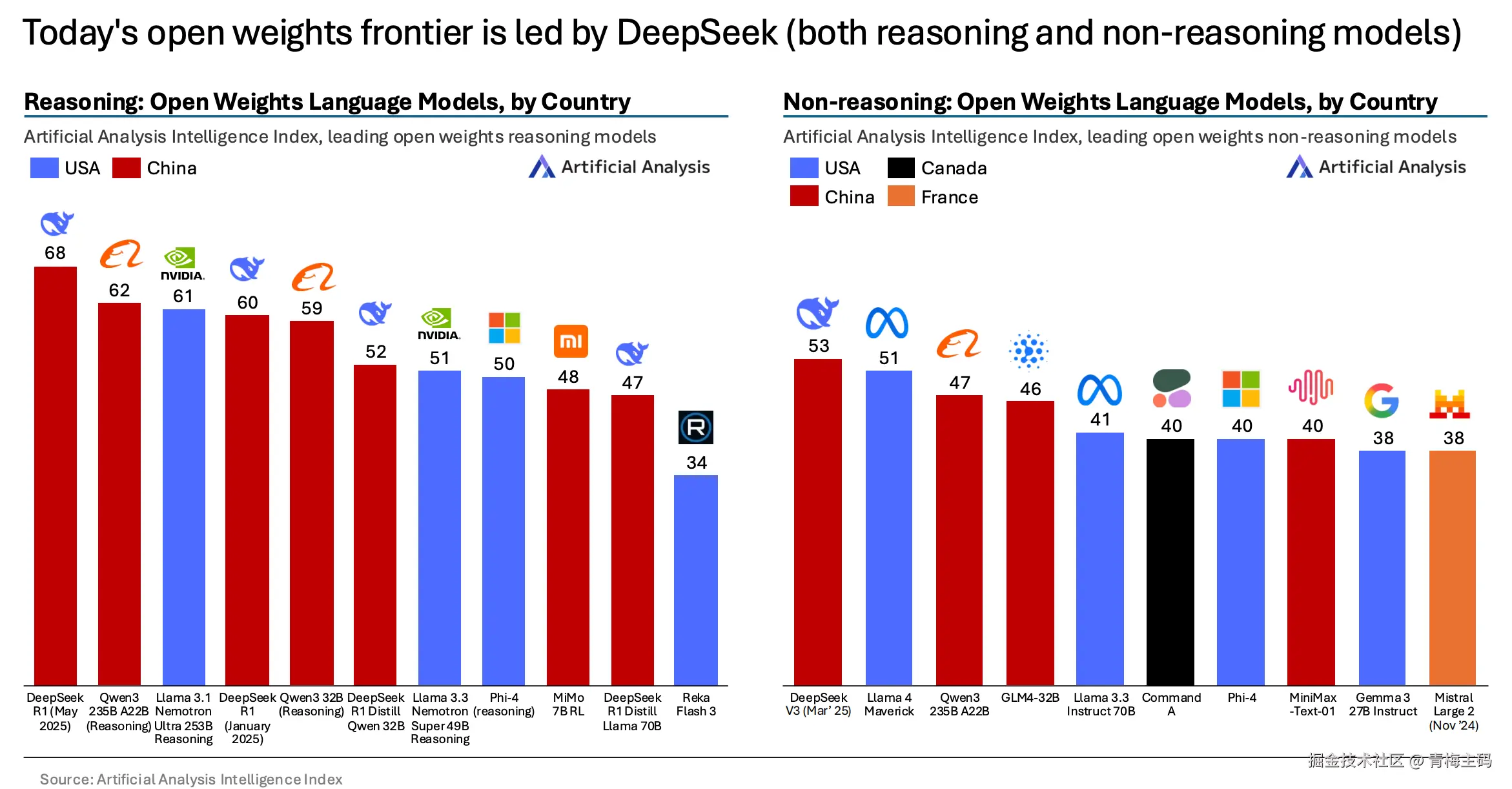 开源权重前沿由 DeepSeek 领导:推理模型 R1 (May 2025)(68),非推理 V3(52)。中国在推理(如 Qwen3 235B A22B (Reasoning) 62)和非推理(如 Qwen3 235B A22B 47)中占有显著份额。
