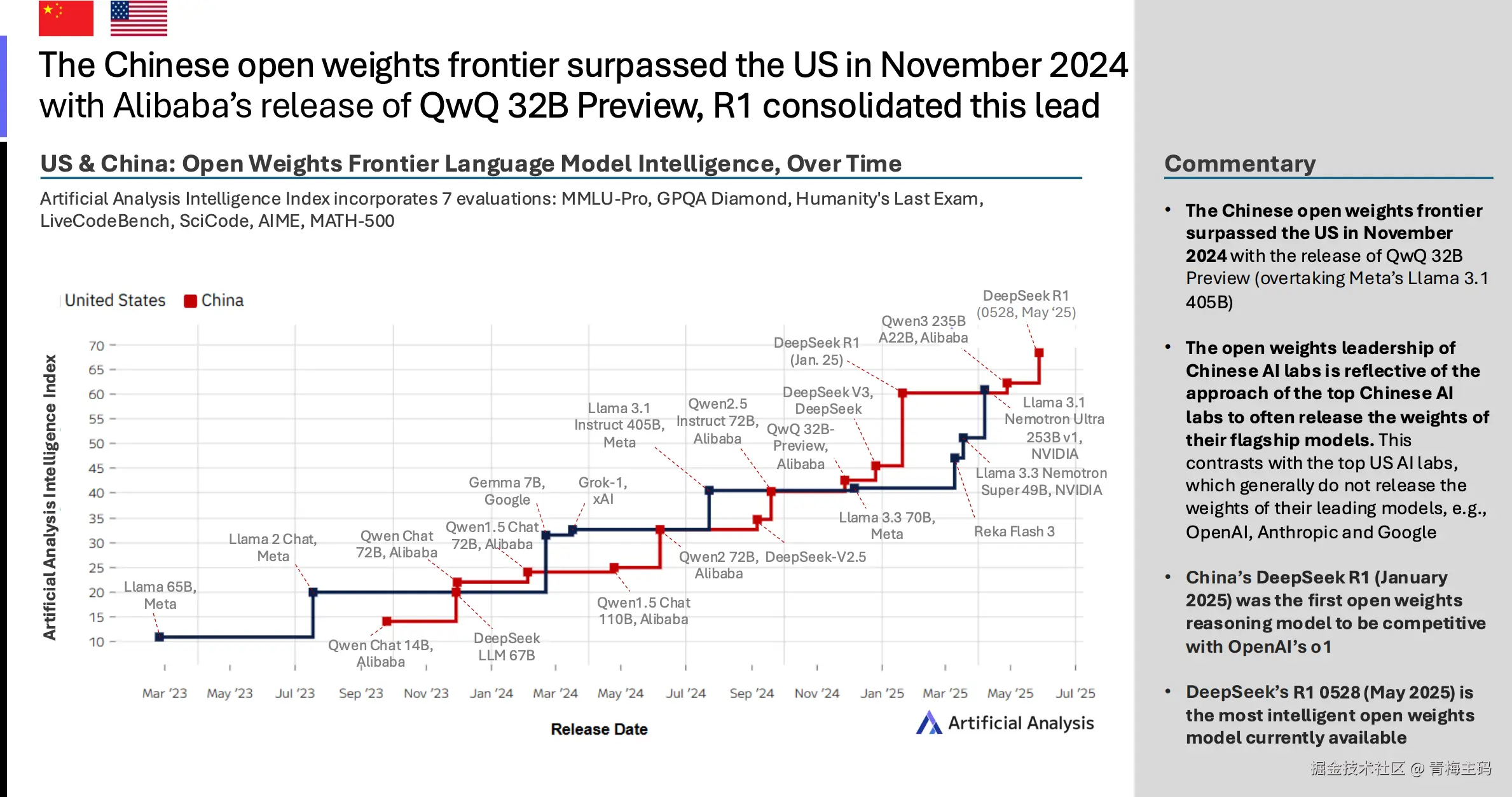 在开源权重模型方面,中国于2024年11月通过 Alibaba 的 QwQ 32B Preview 超过美国(超越 Meta 的 Llama 3.1 405B)。DeepSeek 的 R1(2025年1月)是首个与中国 OpenAI o1 竞争的开源权重推理模型,而 R1 0528(2025年5月)则是当前最智能的开源权重模型。这反映了中国顶级AI实验室倾向于发布旗舰模型权重,与美国实验室(如 OpenAI、Anthropic 和 Google)的封闭策略形成对比。