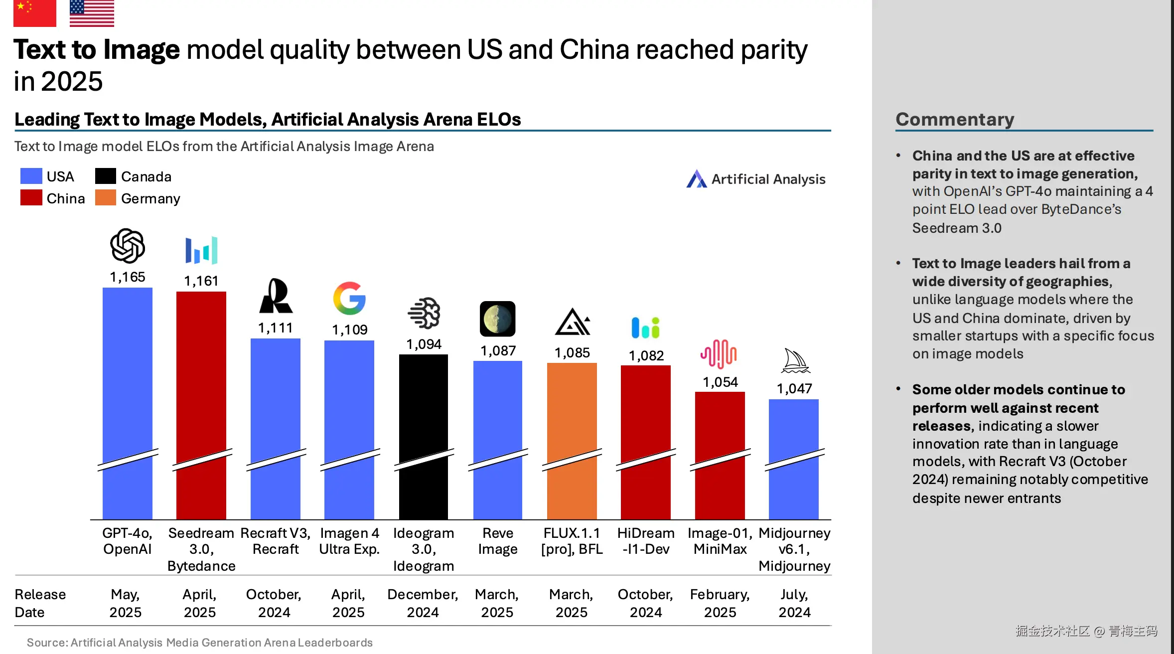 在文本到图像,2025年中美达到 parity,OpenAI GPT-4o(1165 ELO)略领先 ByteDance Seedream 3.0(1161)。其他如 MiniMax Image-01(1111)。