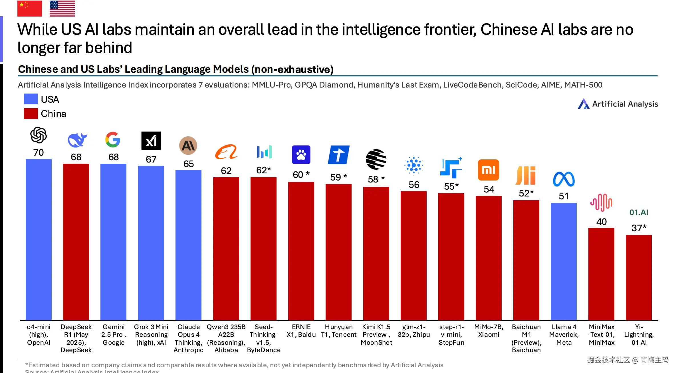 中美领先模型比较显示,美国整体领先,但中国不再落后。顶级中国模型包括 DeepSeek R1 (May 2025)(68)、Alibaba Qwen3 235B A22B (Reasoning)(62)、ByteDance Seed-Thinking-v1.5(62*)。美国包括 OpenAI o3(70*)、Google Gemini 2.5 Pro(68)、xAI Grok 3 Mini Reasoning (high)(67)。