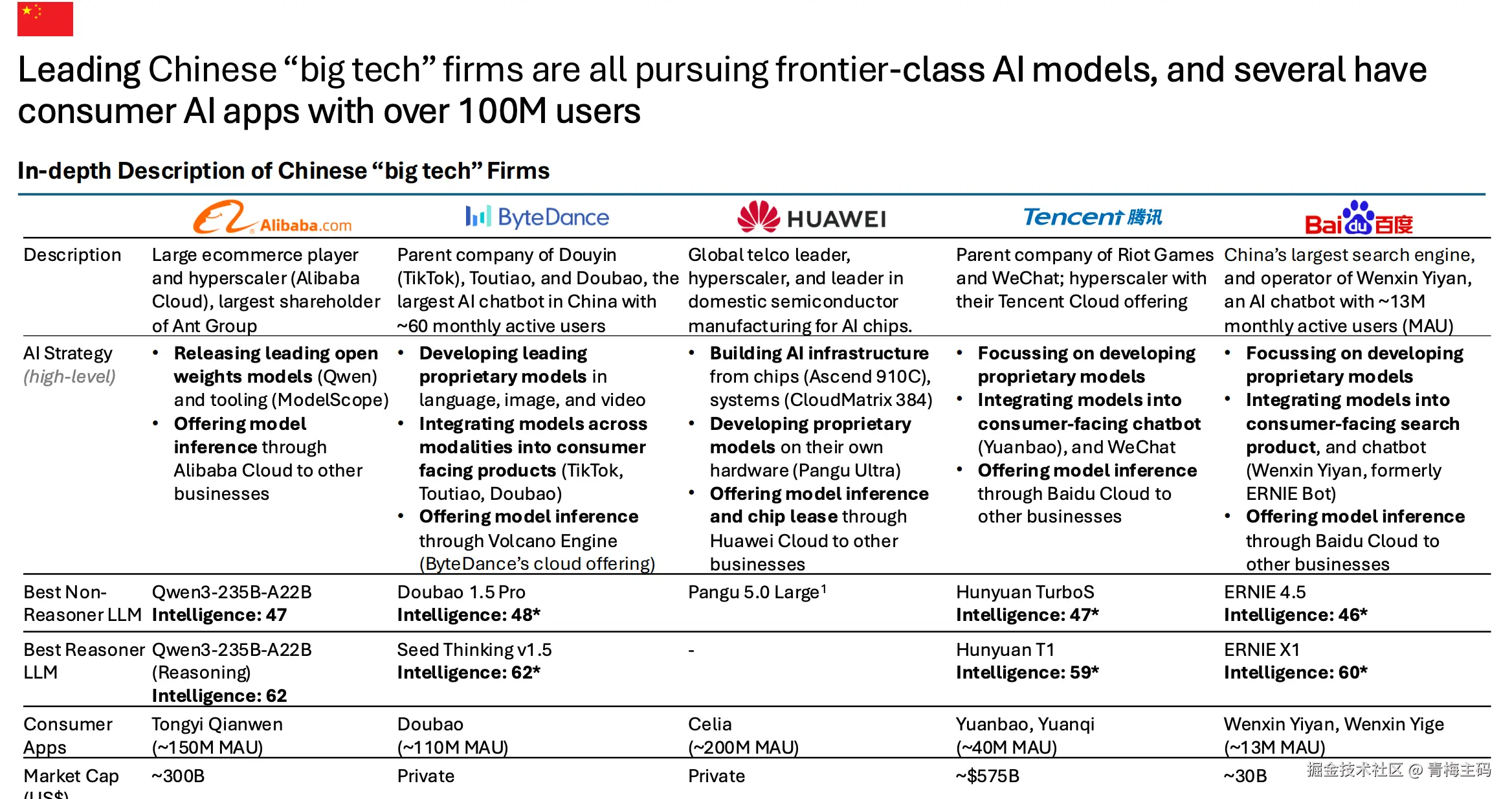 Alibaba:市值约300B美元,策略包括发布领先开源模型(如 Qwen)和通过 Alibaba Cloud 提供推理。最佳非推理模型 Qwen3-235B-A22B(智能47),最佳推理模型 Qwen3-235B-A22B (Reasoning)(62)。消费者应用 Tongyi Qianwen(约150M MAU)。