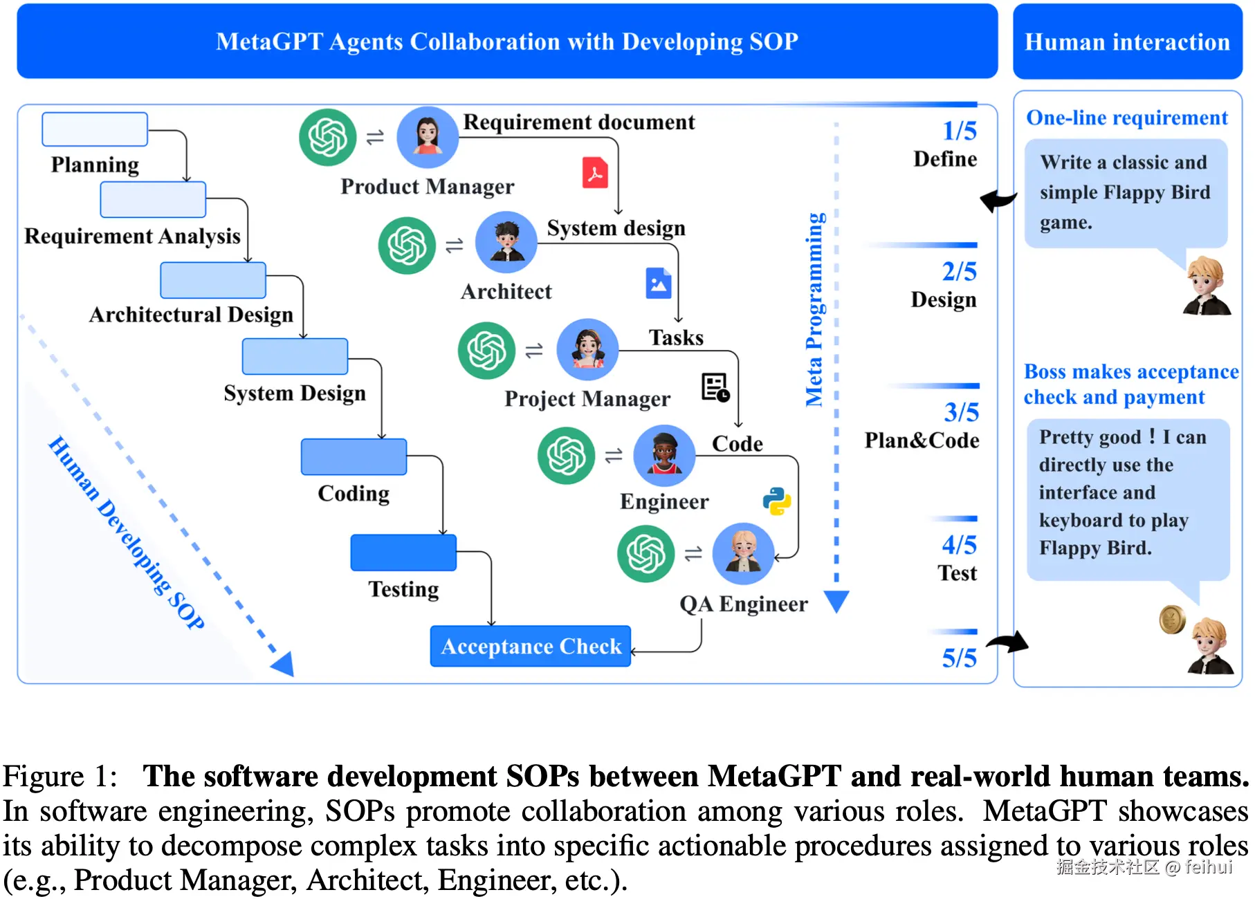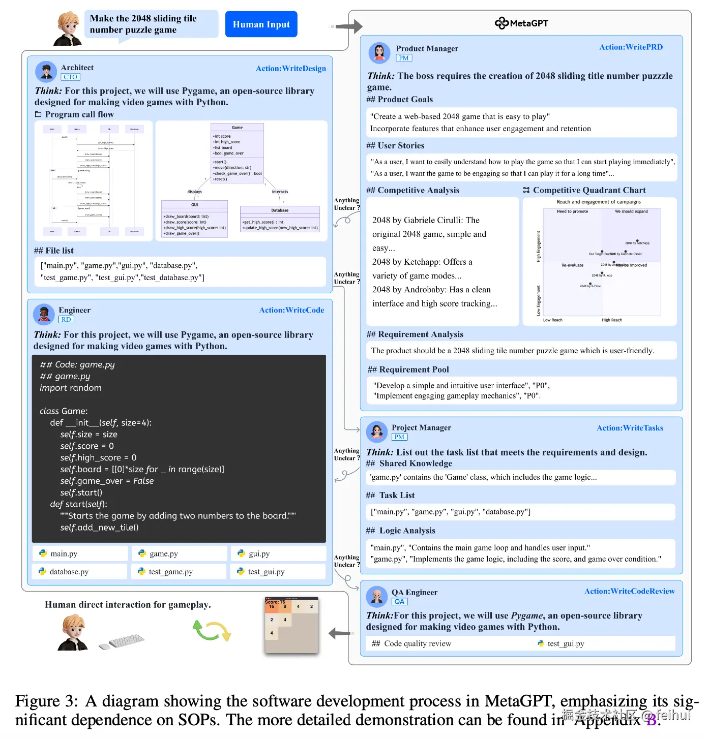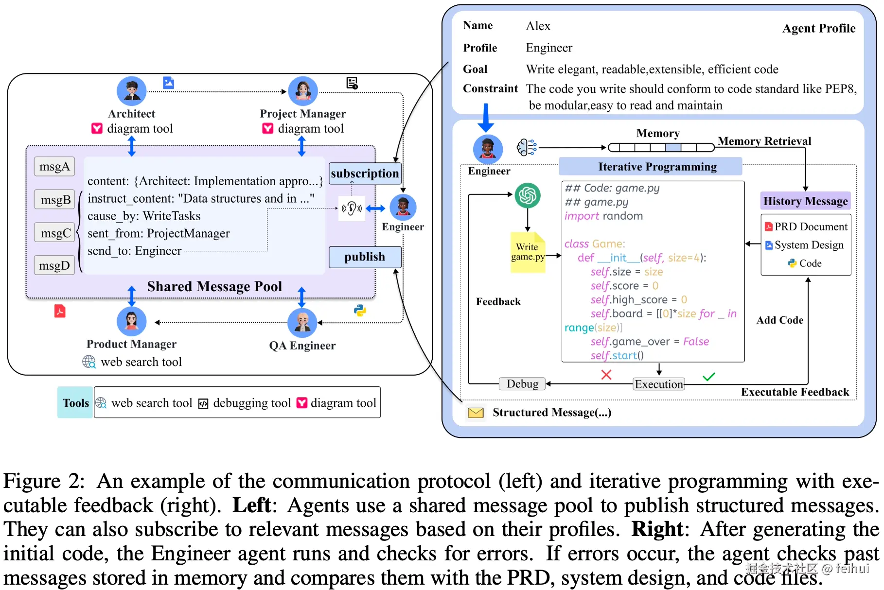 来看一个有趣的 Agent:MetaGPT 是一个 Multi-Agent Framework,其构造一个软件公司 ( 成员包括产品经理 / 架构师 / 项目经理 / 工程师 ),输入一句话需求,输出用户故事 / 竞品分析 / 软件系统 等。