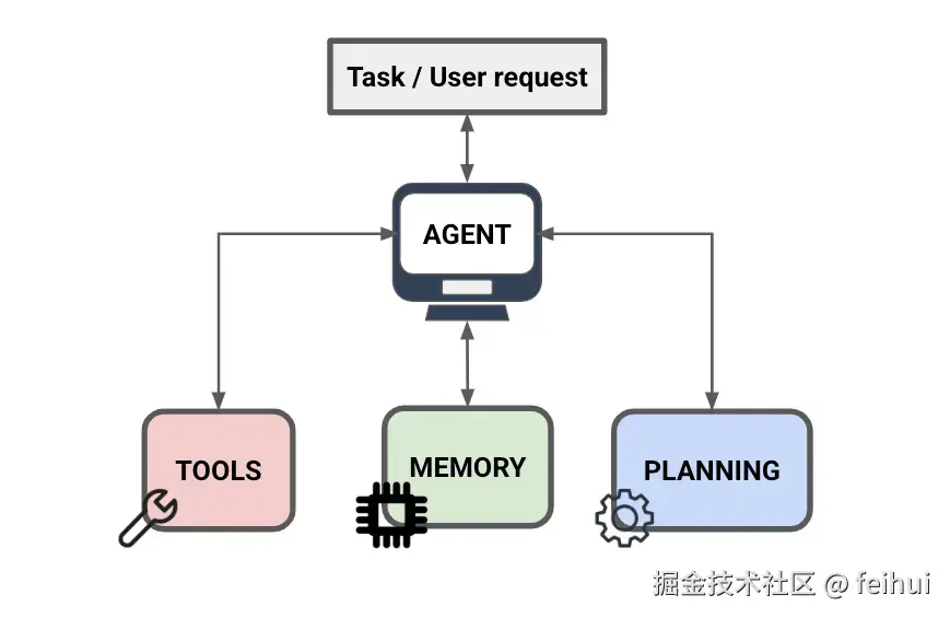 在设计上,Agent 一方面通过角色来代替 Prompt,降低理解成本 ( 当然多少限制了些灵活性,但应对大多数场景已然足够 );另一方面通过 PLANNING、MEMORY、TOOLS 三大模块来组合模型和工具,支持进行丰富的场景 ( 程度取决于工具集大小 ),一个形象理解:类比成旅行社,给出一句话需求,给出完整的出行路线、门票酒店交通预定等。Agent 架构图如下: