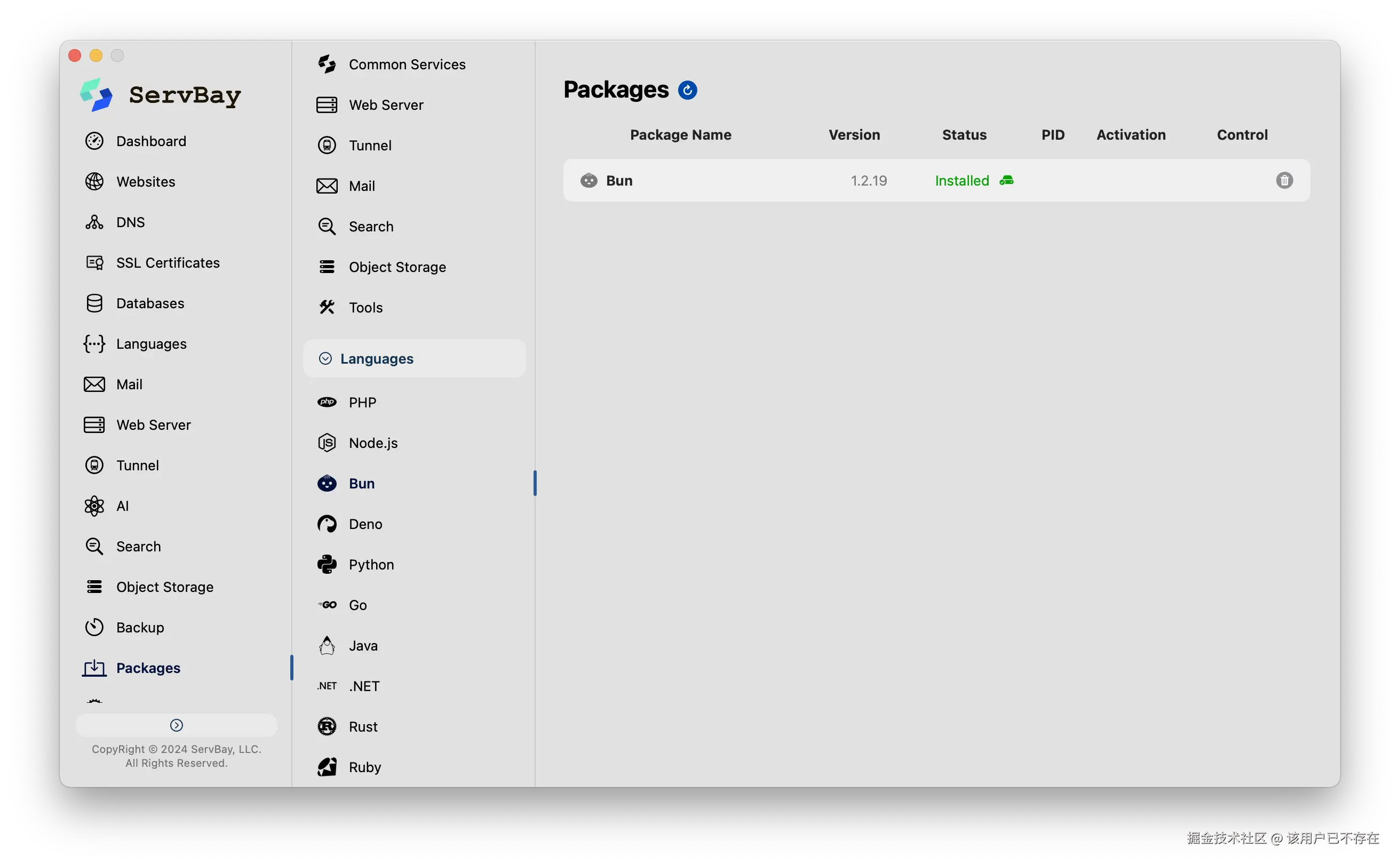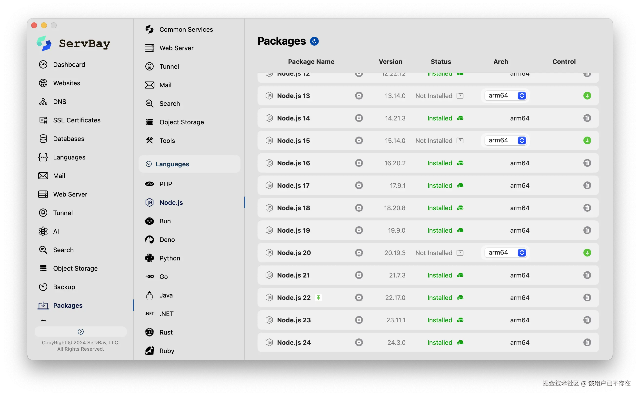 一个很好的例子就是 ServBay( www.servbay.com ),它完美地解决了这个痛点。通过 ServBay,你可以在一个统一的图形界面下,不仅能一键安装和管理 Bun 和 Deno,还能同时运行多个独立的 Node.js 版本(比如 v16, v18, v20),并为不同项目无缝切换。