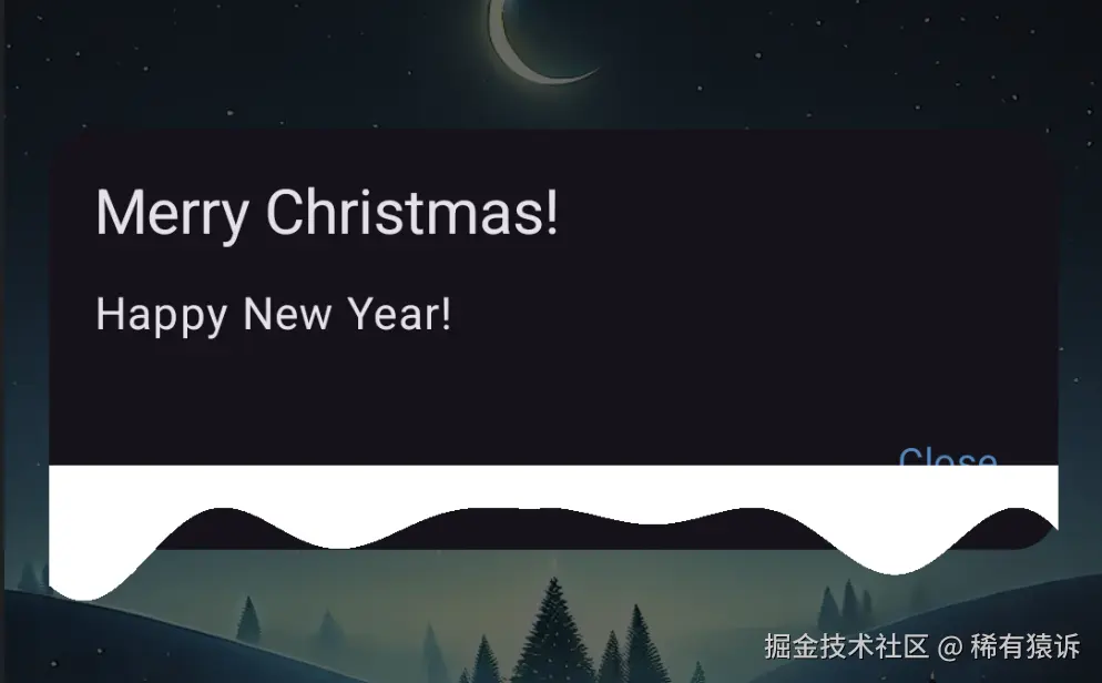 当然,为了让一些雪花出现在屏幕前方,而另一些雪花飘到屏幕后方,我必须在这个着色器中使用两层。这是对话框可组合函数的最终效果: