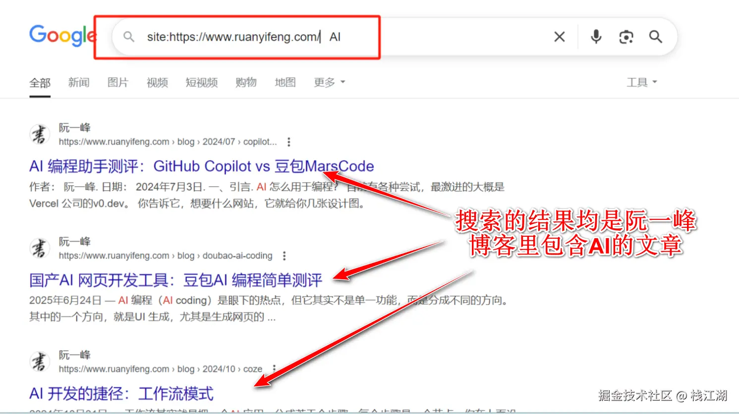 比如用google搜索某个网站里的内容,就可以使用site:网址+关键字的方式来搜索,这样搜索出来的就是当前网站里所以包含关键字的内容了。