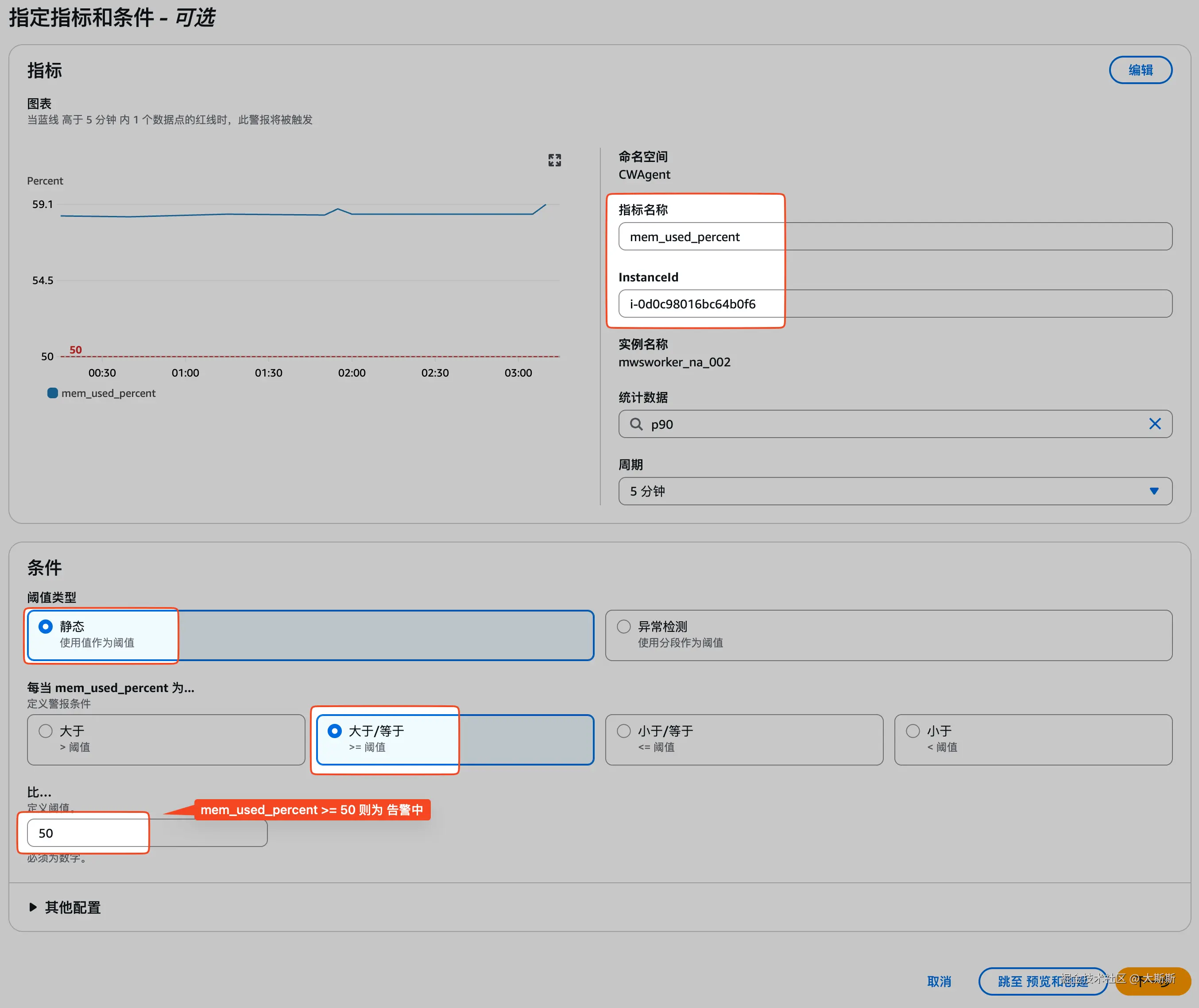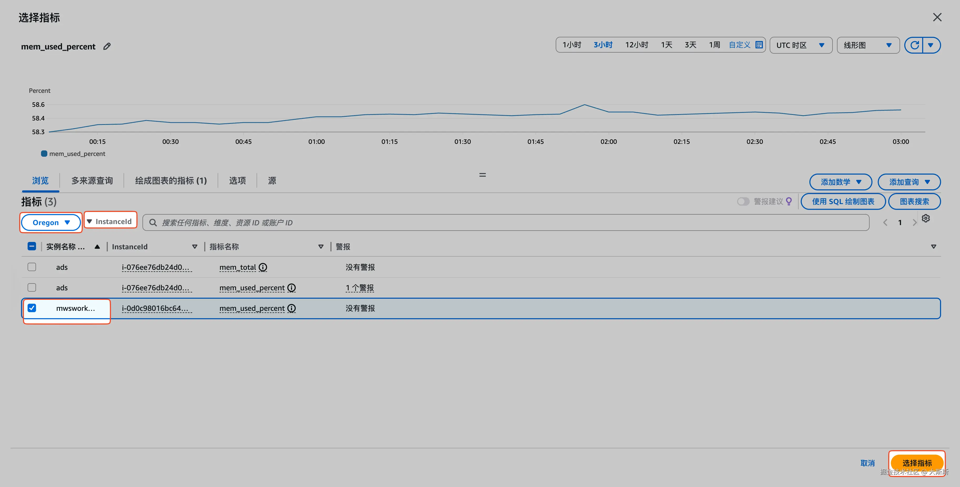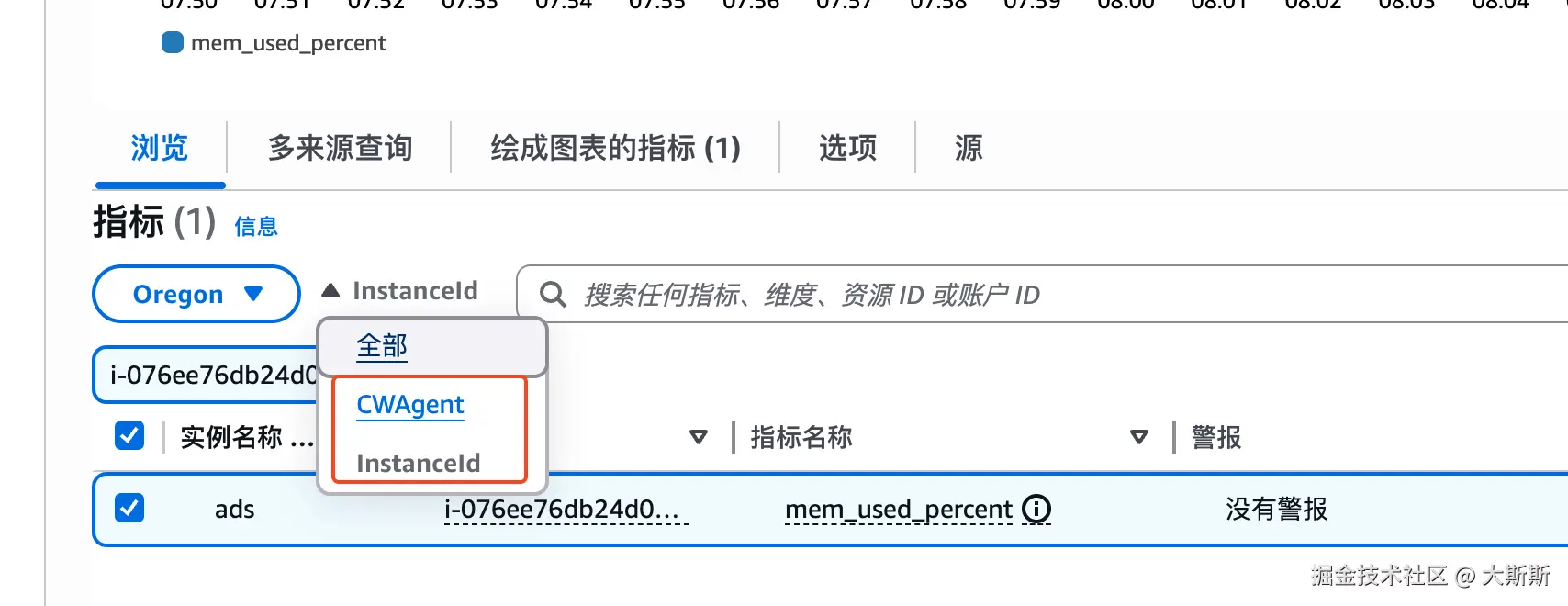 - 选择命名空间 “CWAgent”,维度选择 “InstanceId”