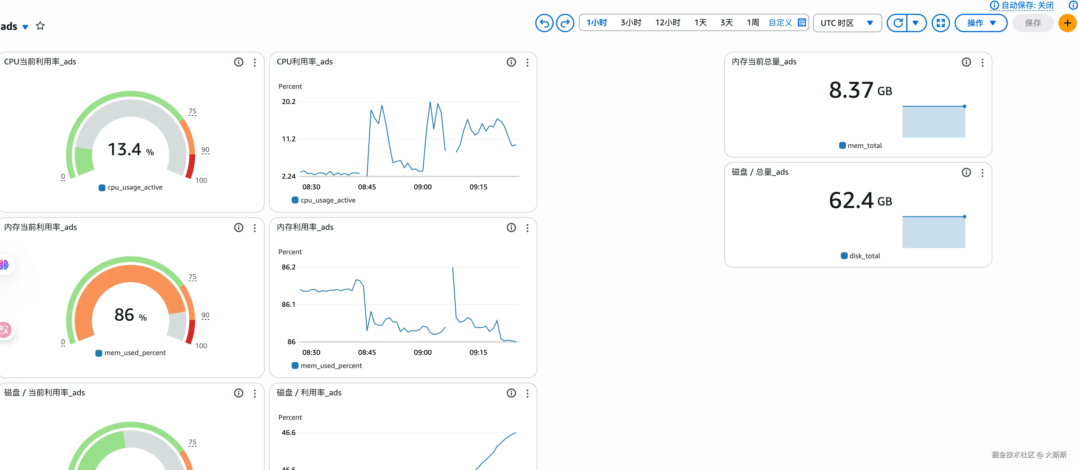 🤖 第 5 步:选择配置 配置需要关注的指标,如下图,配置了 内存、CPU、磁盘 的利用率: