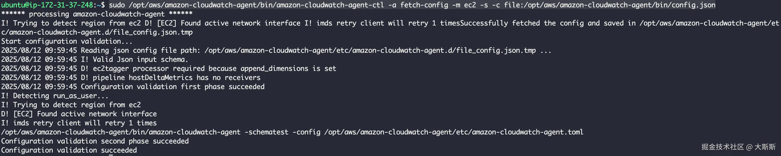 sudo /opt/aws/amazon-cloudwatch-agent/bin/amazon-cloudwatch-agent-ctl -a fetch-config -m ec2 -s -c file:/opt/aws/amazon-cloudwatch-agent/bin/config.json