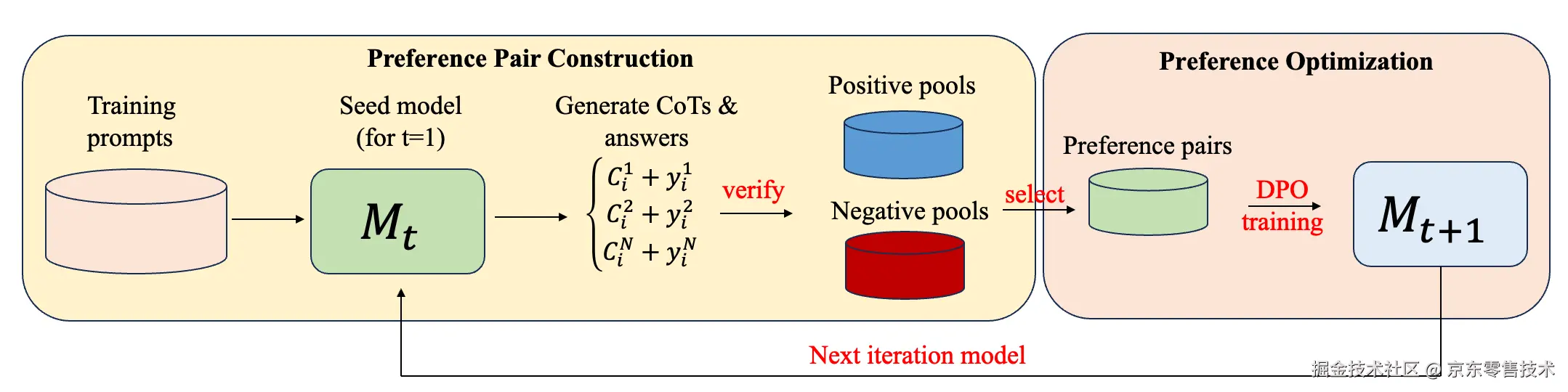 具体而言,在每次迭代中,我们从训练提示中采样多个思维链推理步骤和最终答案,通过验证最终答案,构建正例池和负例池,在正、负例池根据距离挑选来构建偏好对,然后进行DPO训练。在训练新模型后,我们通过生成新偏好对并重新训练来迭代该过程。我们发现推理性能在多次迭代后逐渐提高,最终达到饱和。