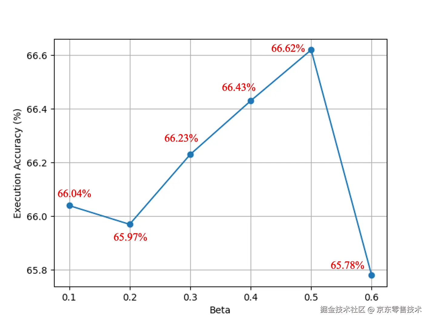 我们通过DPO方法进行训练, beta是DPO Loss中的权重系数,数值越小越忽略参考模型,通常取0.1~0.5。因为我们观察到DPO对齐算法对这一参数特别敏感。我们设置了beta从0.1、0.2 、...、0.6变化。所有实验均训练两个 epoch。每次运行时,其他超参数保持不变,包括随机种子。不同beta值对应的执行准确率如下图所示。当beta取0.5时,达到最高的执行准确率,后续的DPO迭代中我们都延续使用该beta值。