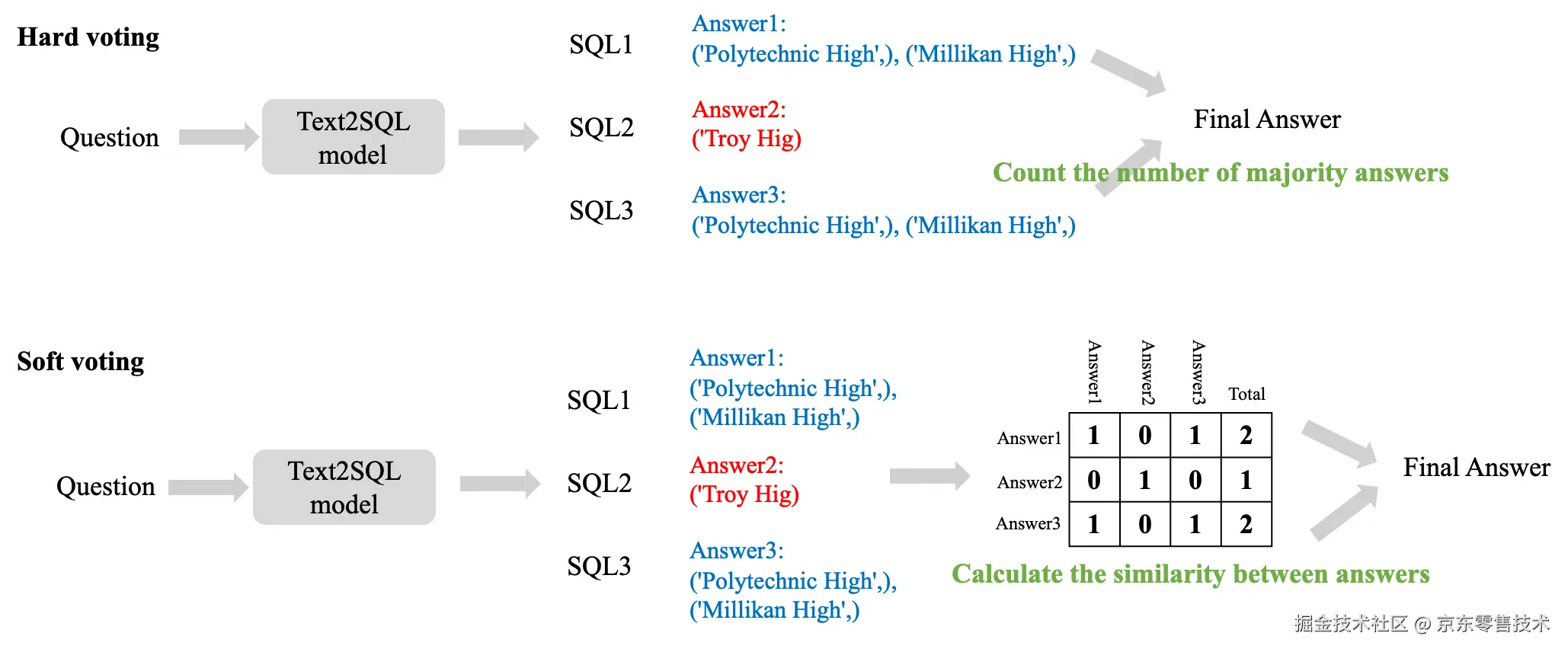 在实现自洽性的过程中,我们使用了硬投票和软投票两种方式。硬投票直接根据模型生成结果的最终表现(如执行结果是否正确,二元判断)进行投票,不考虑结果之间的相似程度。软投票的决策依据是根据结果之间的相似程度(连续值)。如下图所示。