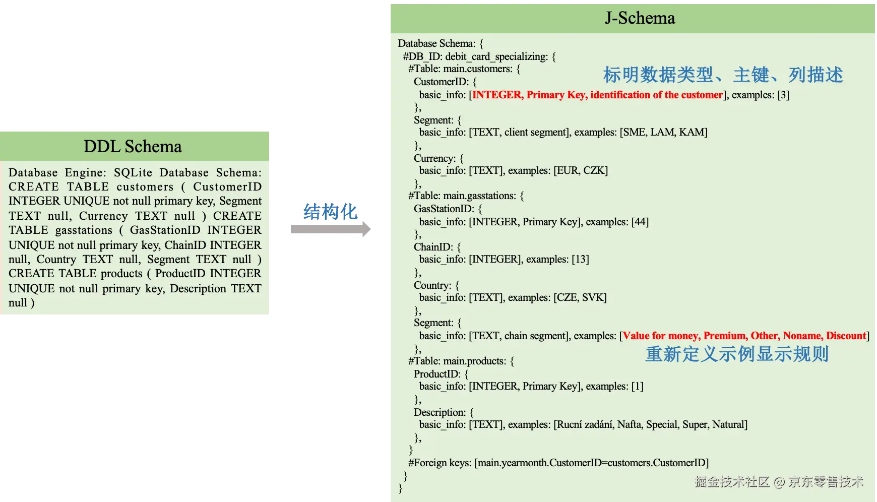 要让 LLM 理解数据库结构,需在提示中提供数据库模式。为此,我们提出一种名为 J-Schema 的新型数据库表达方式。J-Schema 以完全结构化的格式呈现数据、表与列之间的层次关系,并采用特殊标记进行识别:用 “#DB_ID” 标记数据库,“#Table” 表示表,“#Foreign keys” 表示外键。对于每个表,会给出表名;列信息则通过 “basic_info” 标识,其中包含列名、列描述、主键标识符,且为每个列提供示例值。