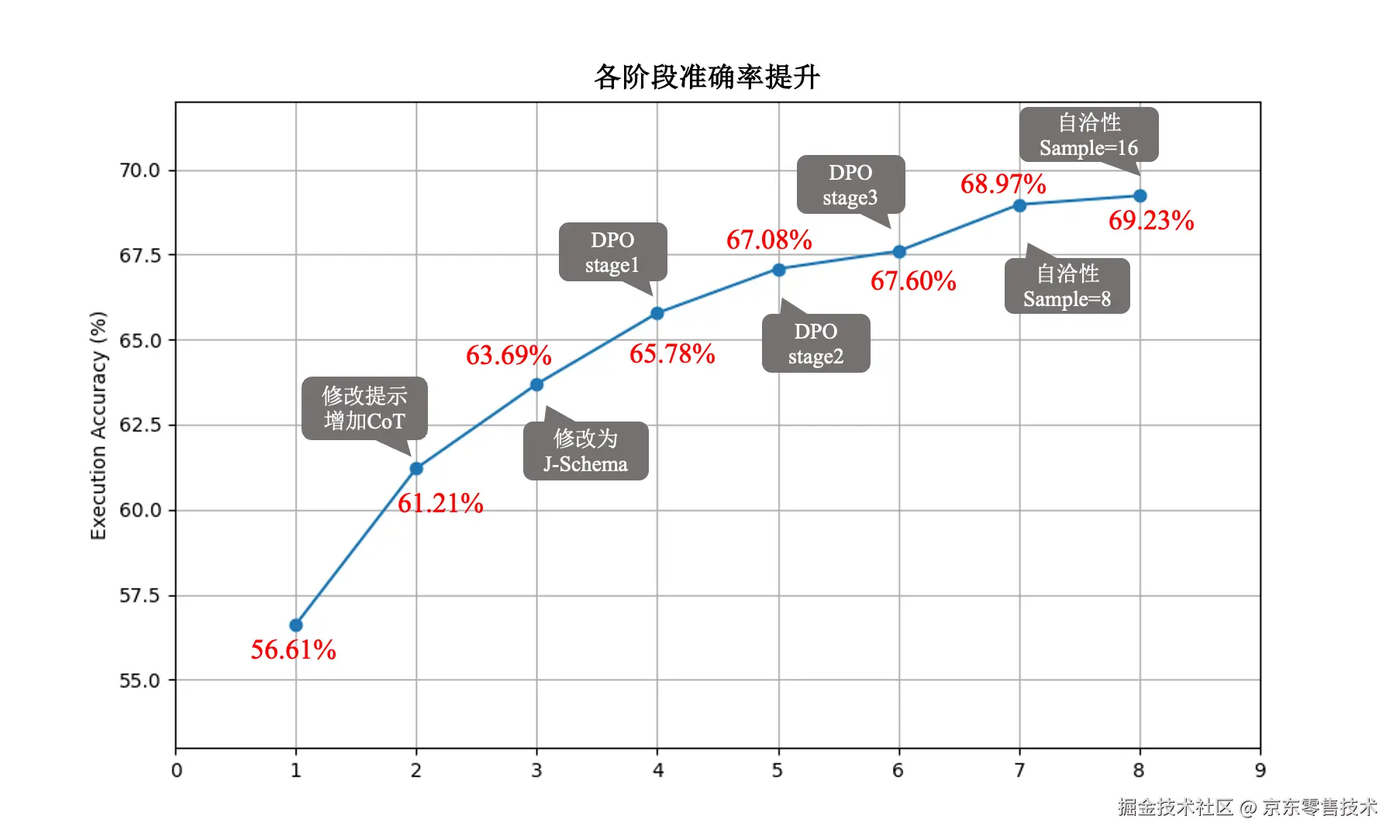 结果:解决 Text2SQL 性能提升的三大难题,将模型在 BIRD 数据集上的执行准确率从 56.6% 提升至 69.2%。