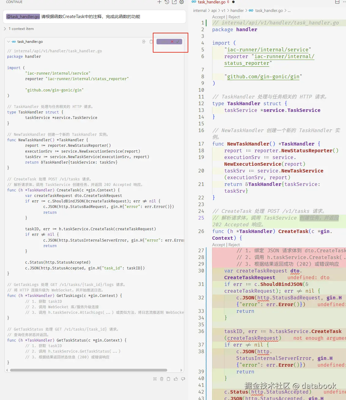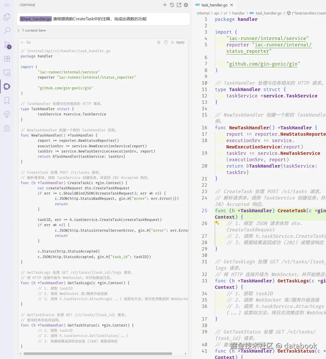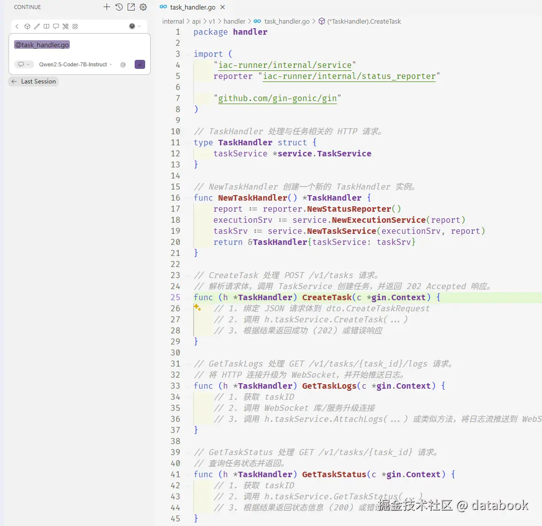 接下来,我们让AI帮我们生成CreateTask这个函数的代码: