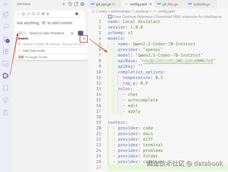就可以打开 Continue 的配置文件(yaml格式的),然后参照如上图的配置。