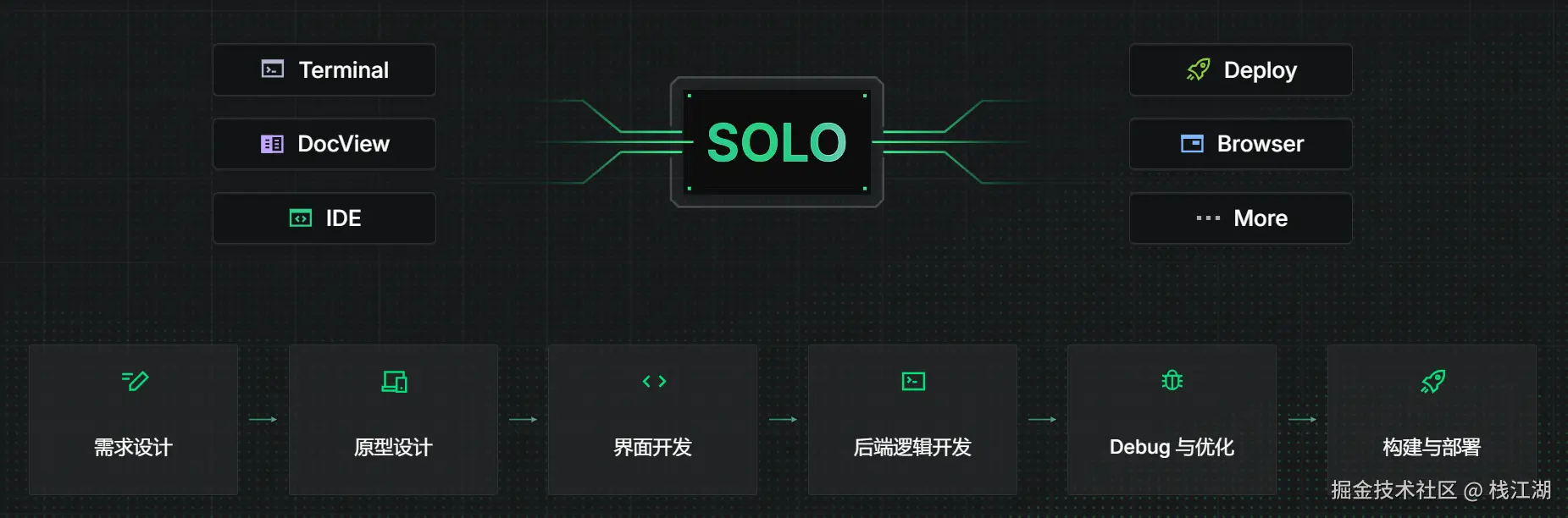 SOLO模式就AI可以从需求设计、原型设计、界面开发、后端逻辑开发、优化调试到构建部署它可以一条龙的完成。