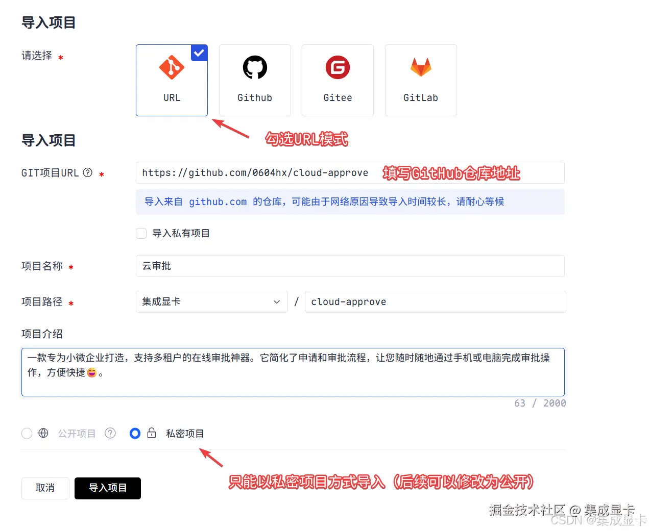 进入 GitCode 主页,点击右上角的+新建后选择导入项目,在新开页面中选择URL,然后填写 GitHub 的仓库地址,最后点击导入项目,等待几秒钟即可完成👍。